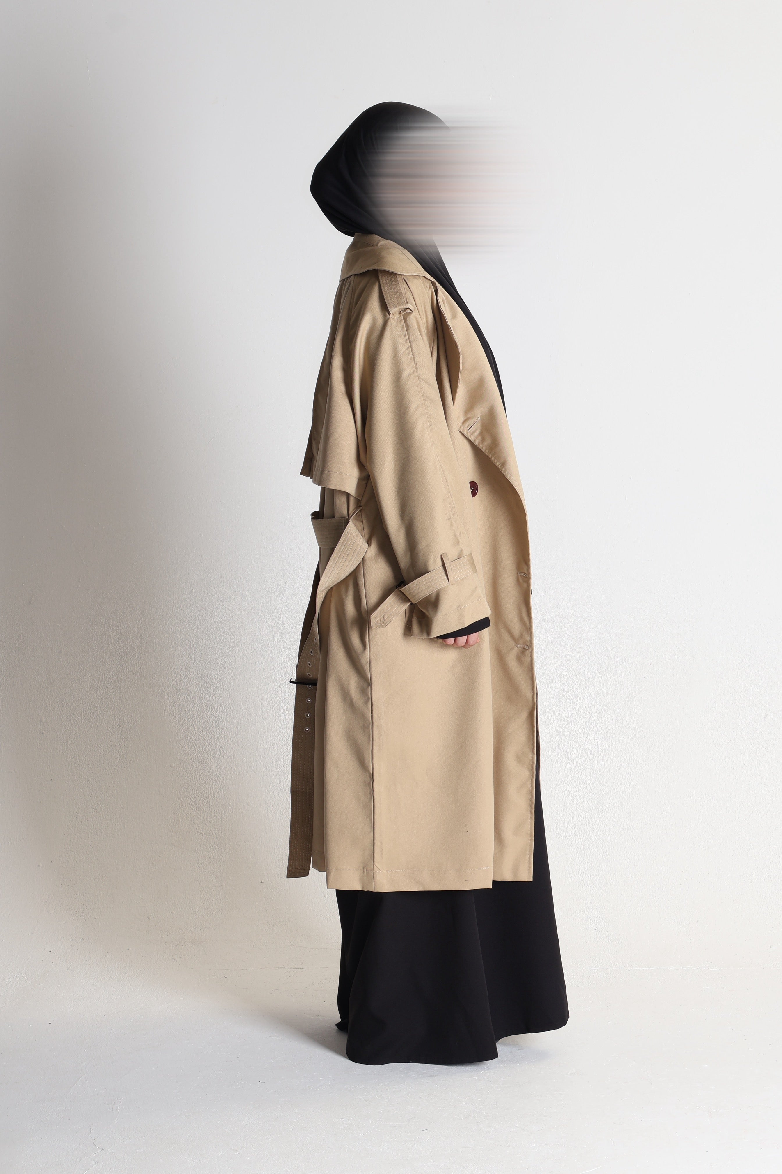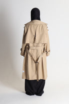 Complete with side pockets, an adjustable buckled belt to complete the look, buttoned tabs on the shoulders, a back vent at the hem and double-breasted button fastening at the front. Features a Hassanï tag on the lower side of the coat. A staple piece for your modest outfits.