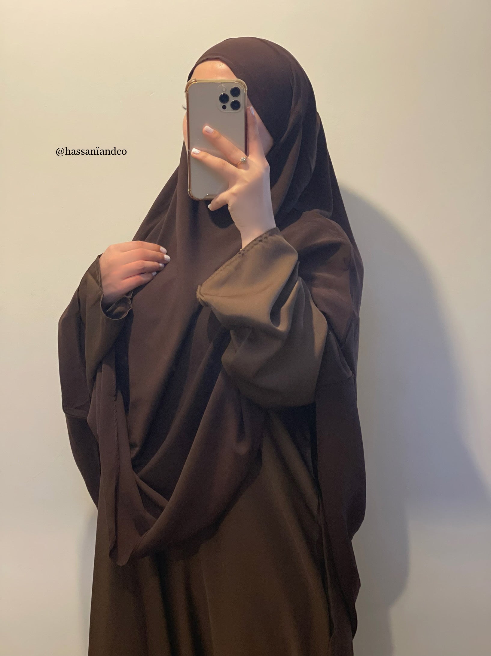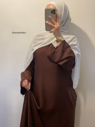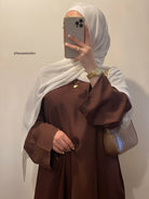 Our straight cut, yet loose fit chocolate brown abaya. A beautiful, deep brown colour, an essential for every lady’s wardrobe. Tailored with wide sleeves fitted with a hidden button inside to give you the option of preventing the sleeve from sliding as well as a side slit pocket, for day to day convenience!