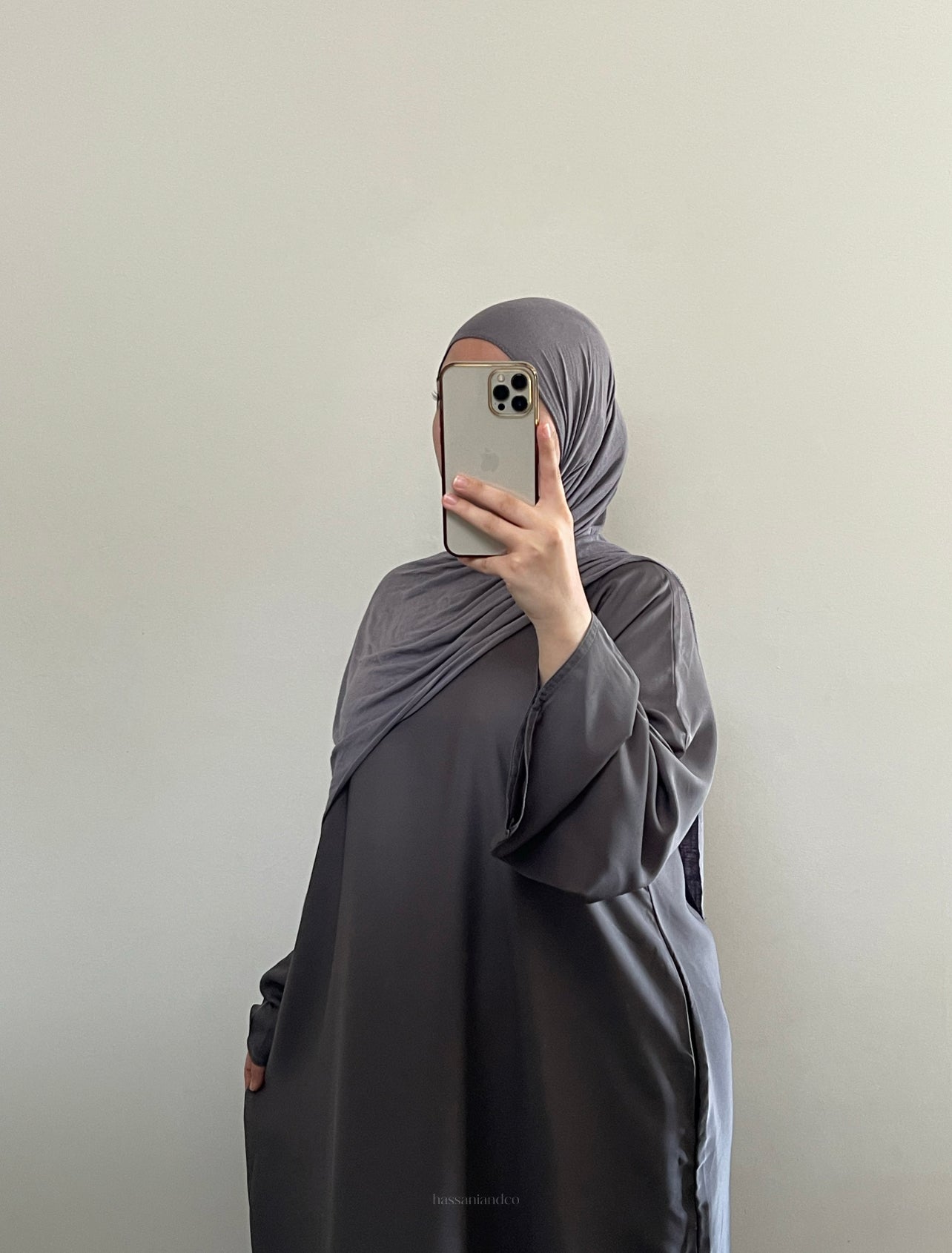 Our straight cut, yet loose fit soft dark grey abaya. A beautiful colour perfect for your neutral wardrobe! Tailored with wide sleeves fitted with a hidden button inside to give you the option of preventing the sleeve from sliding as well as a side slit pocket, for day to day convenience! Complete with a Hassanï tag at the bottom