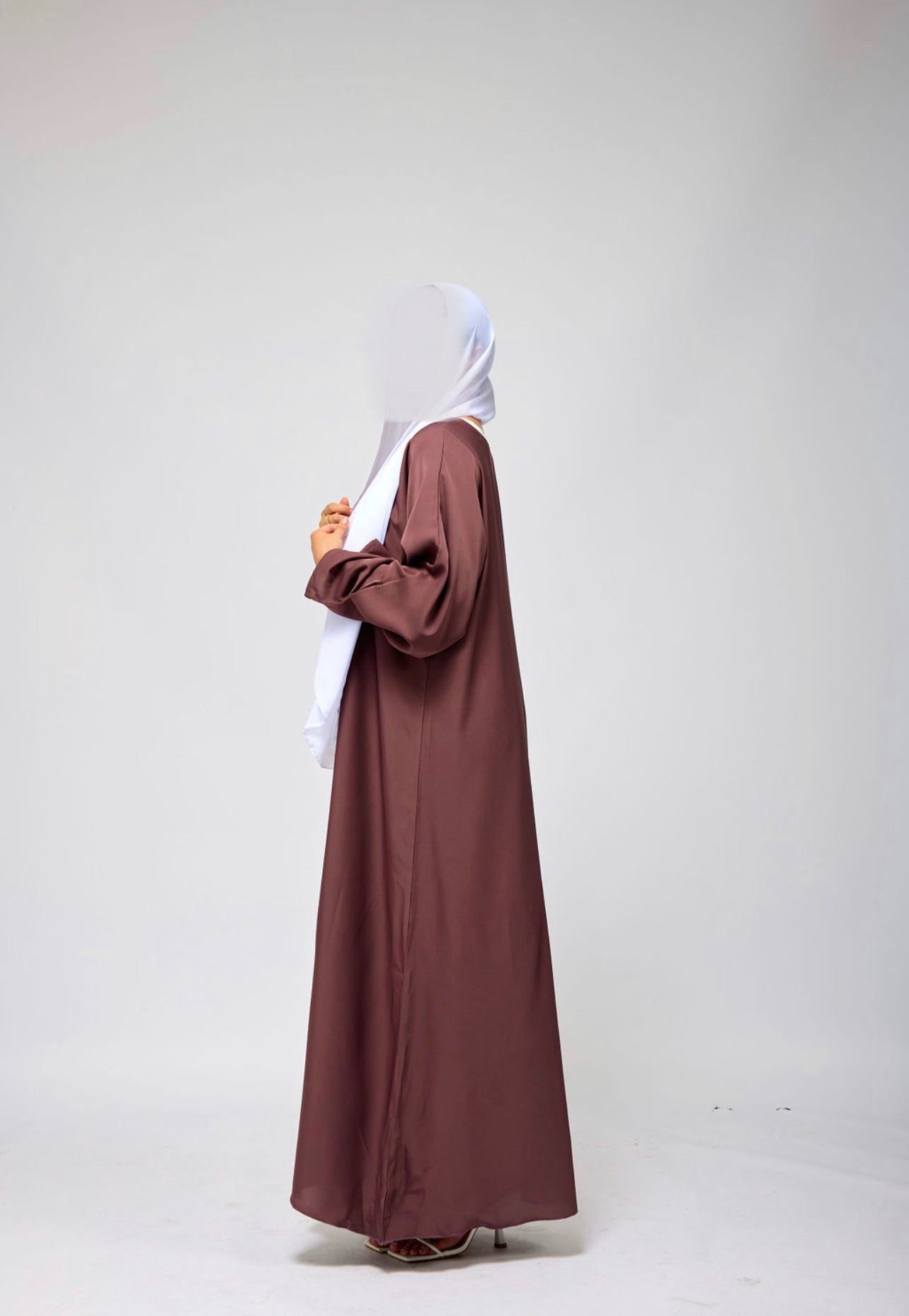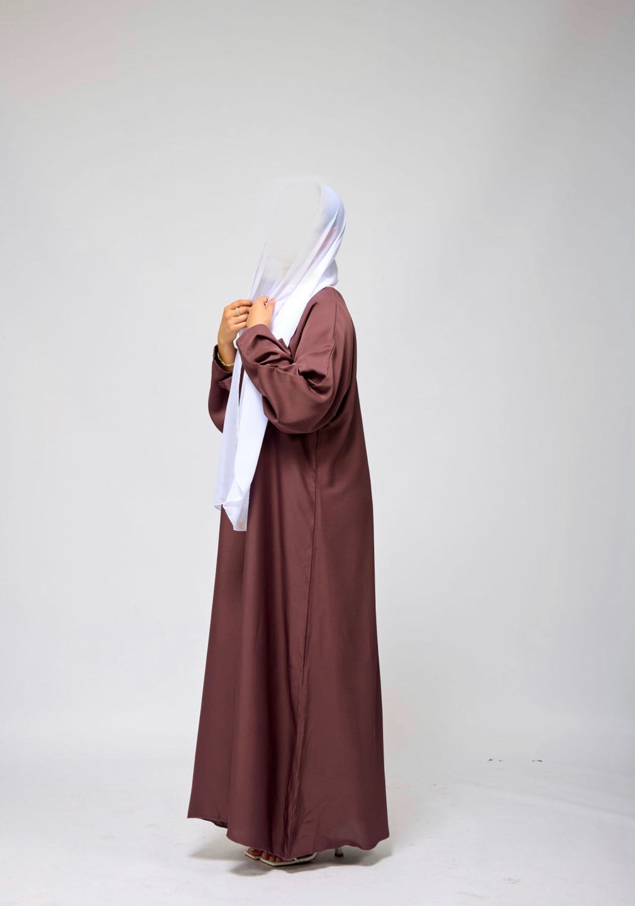 Our straight cut, yet loose fit plum purple abaya. A beautiful, summer colour, an essential for every lady’s wardrobe. Tailored with wide sleeves fitted with a hidden button inside to give you the option of preventing the sleeve from sliding as well as a side slit pocket, for day to day convenience!
