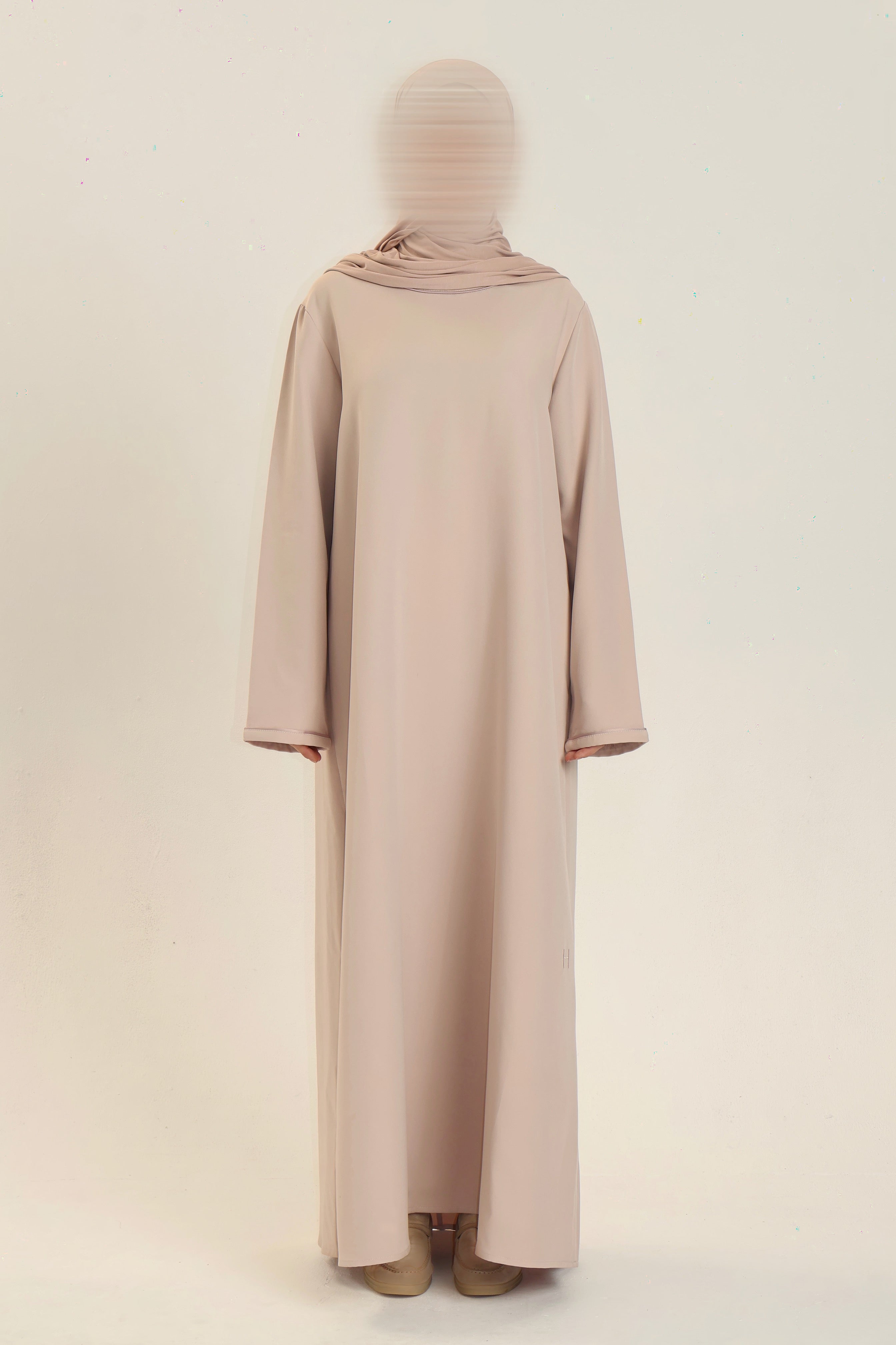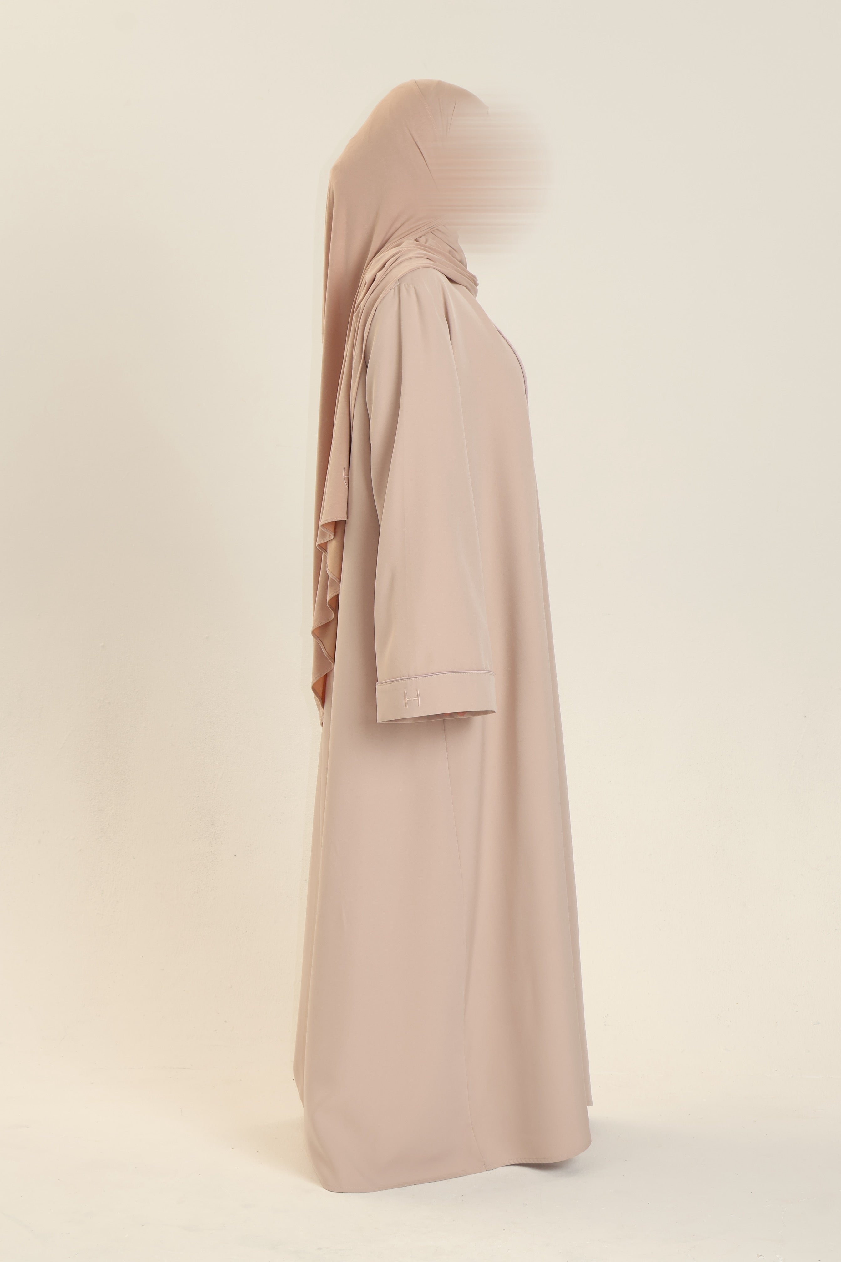 Comprised of a fitted inner slip abaya with clean long sleeves and a streamlined silhouette. Over it, the outer abaya drapes effortlessly; oversized, open-front, and detailed with wide sleeves, two discreet side pockets, and tonal piping that runs the length of the body and sleeves. Finished with our subtle H embroidery for a signature touch.
