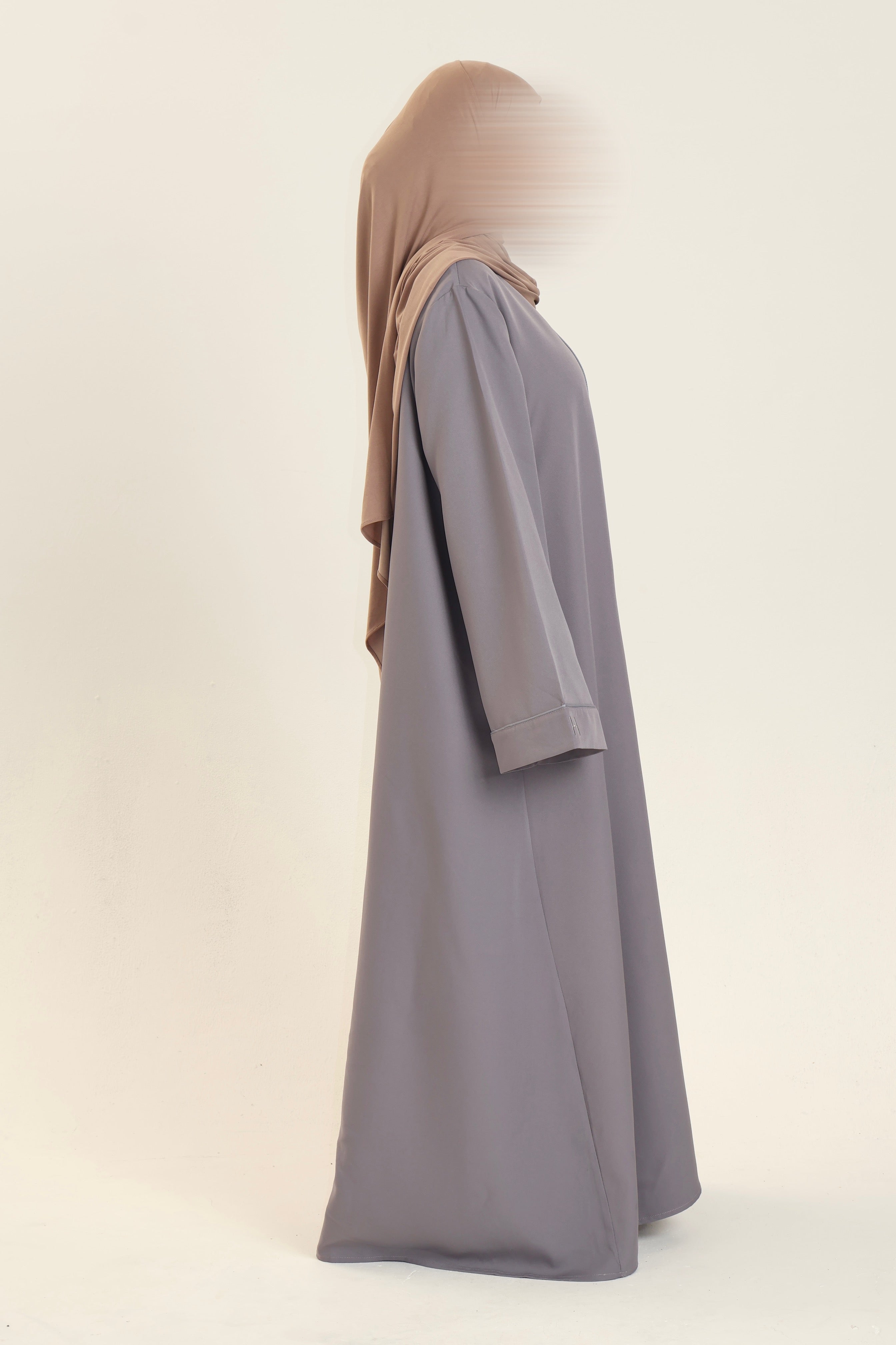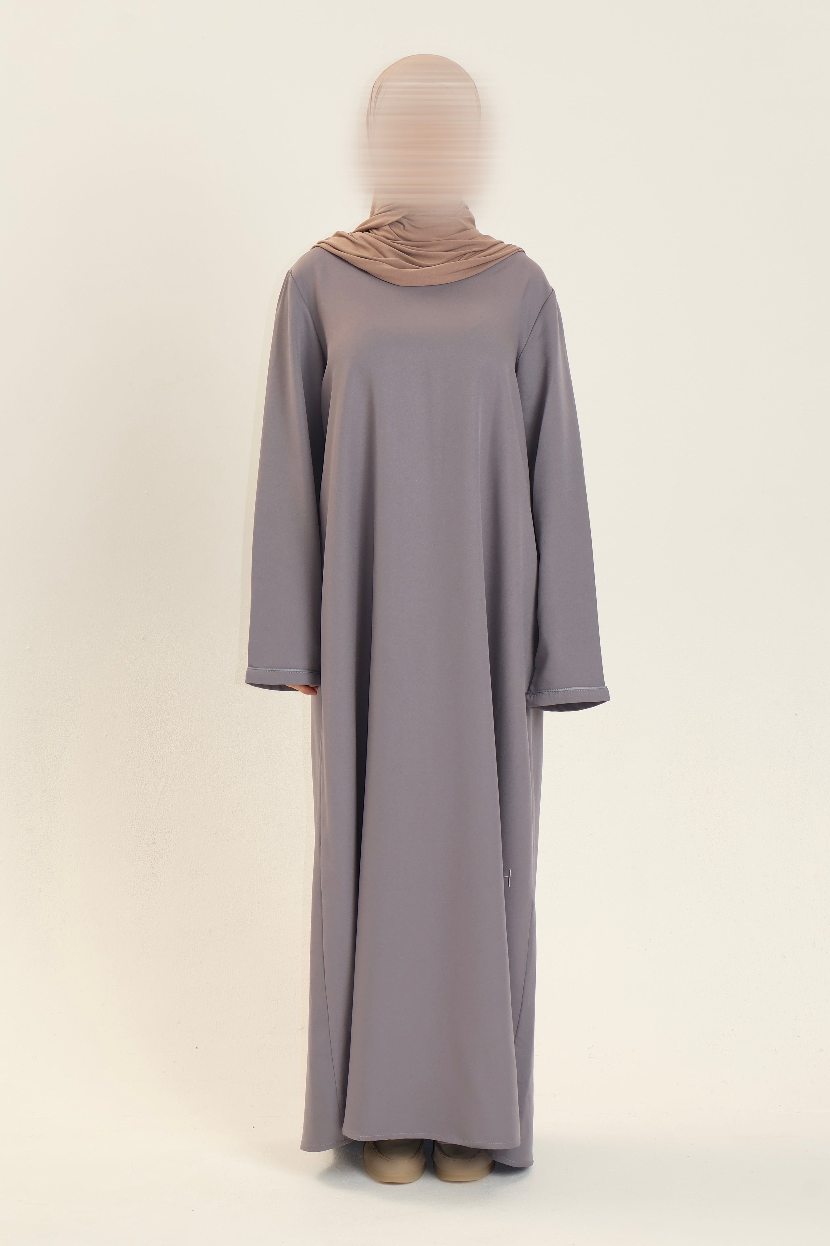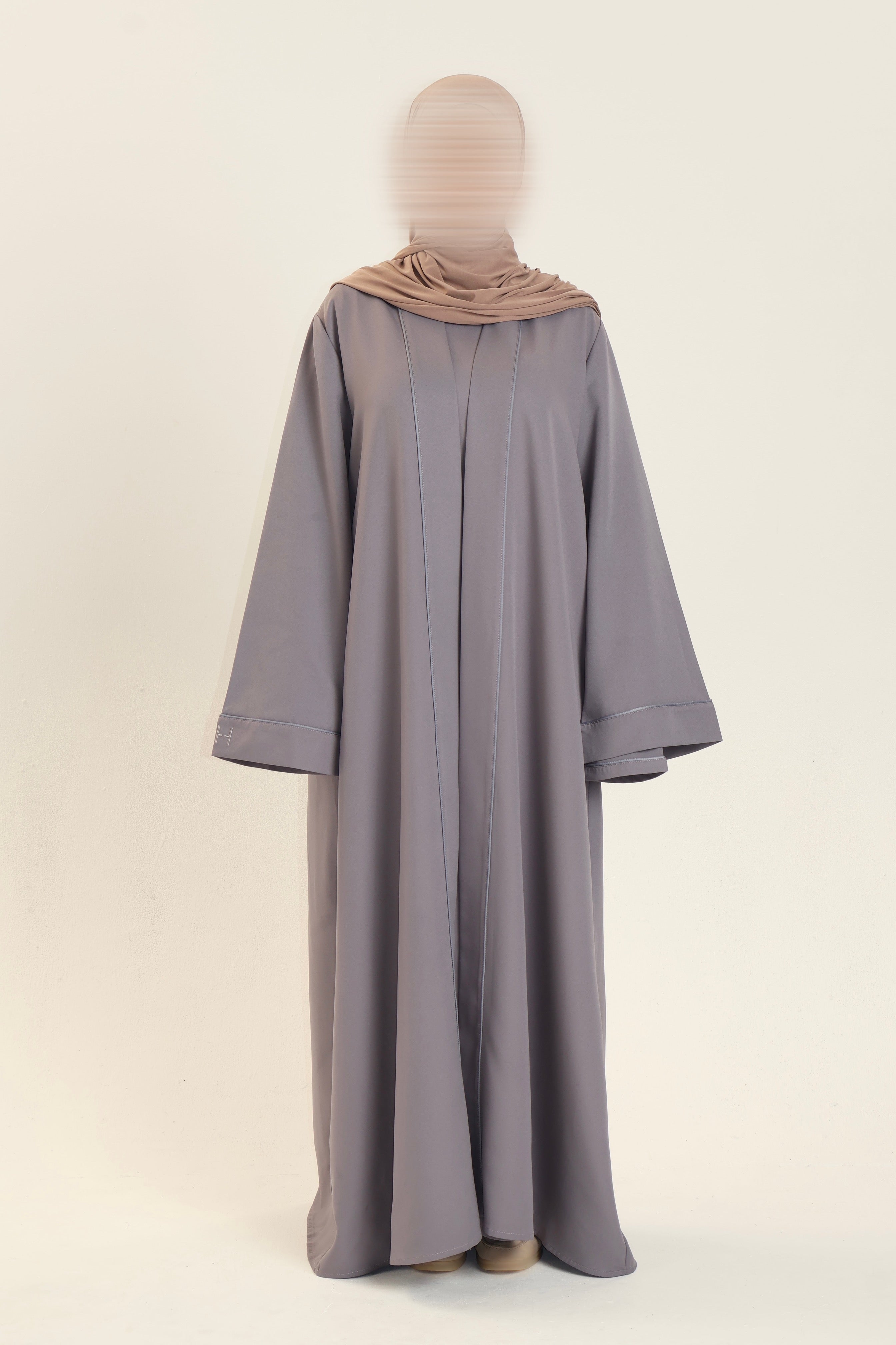 Comprised of a fitted inner slip abaya with clean long sleeves and a streamlined silhouette. Over it, the outer abaya drapes effortlessly; oversized, open-front, and detailed with wide sleeves, two discreet side pockets, and tonal piping that runs the length of the body and sleeves. Finished with our subtle H embroidery for a signature touch.