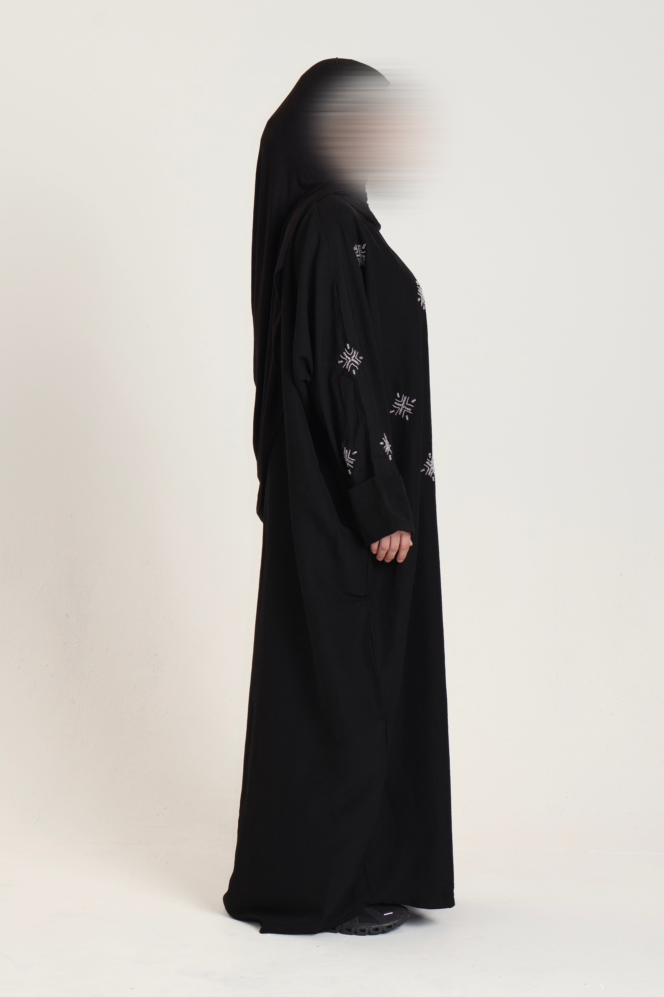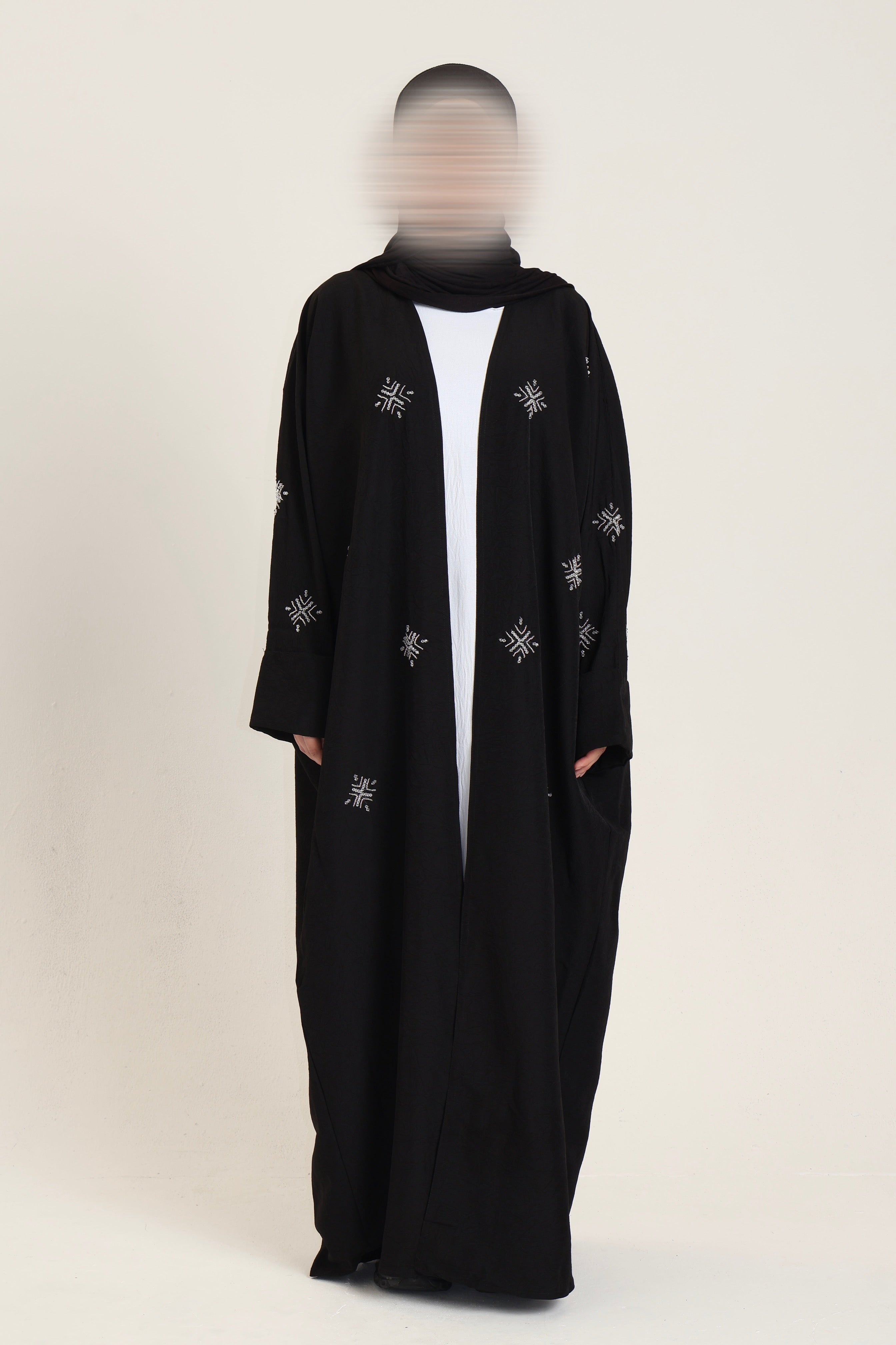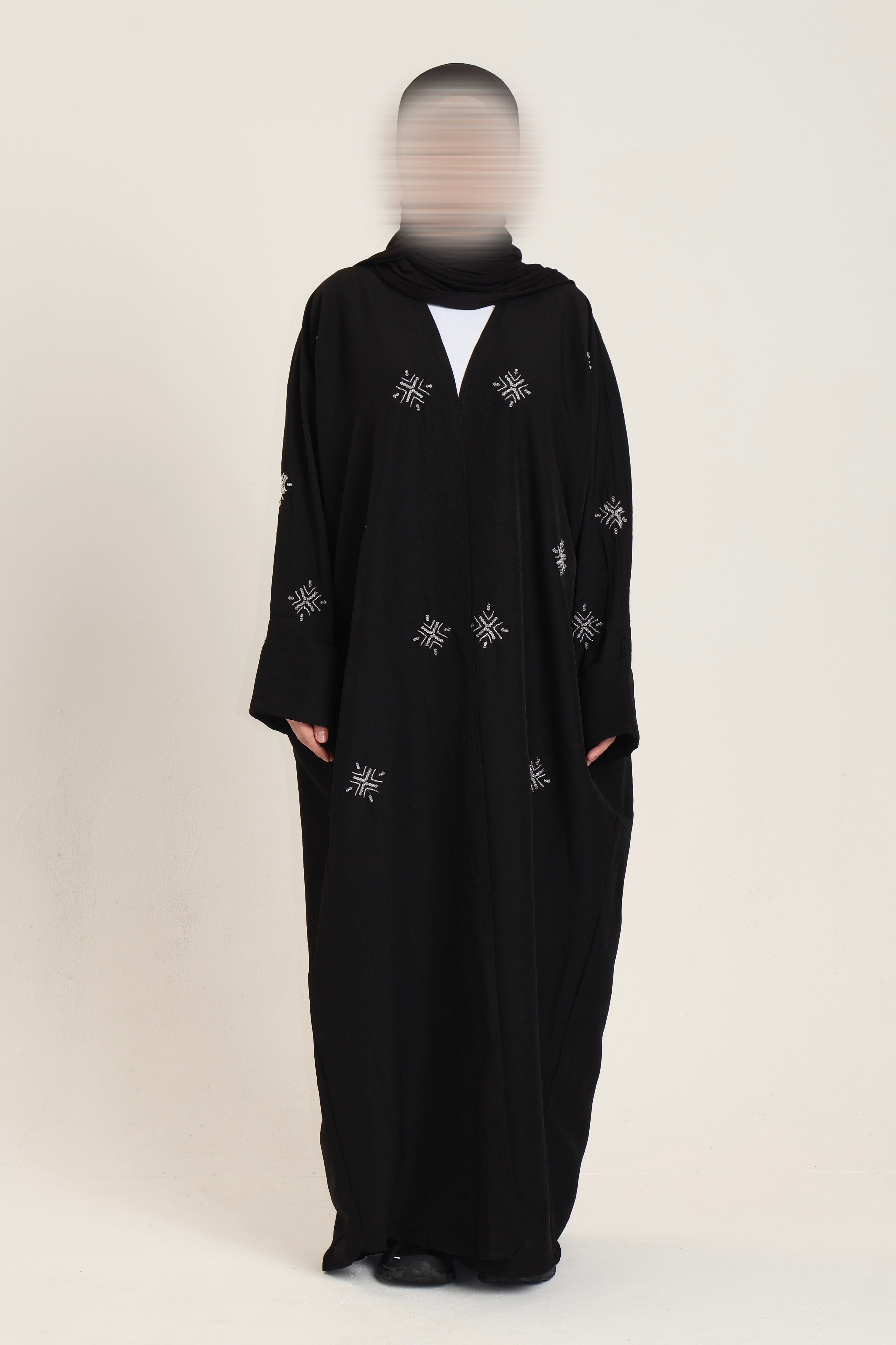 A black abaya with hand-stitched star like, beadwork detailing on the sleeves. Made from a slightly crinkled fabric which is ideal for any weather type.