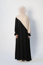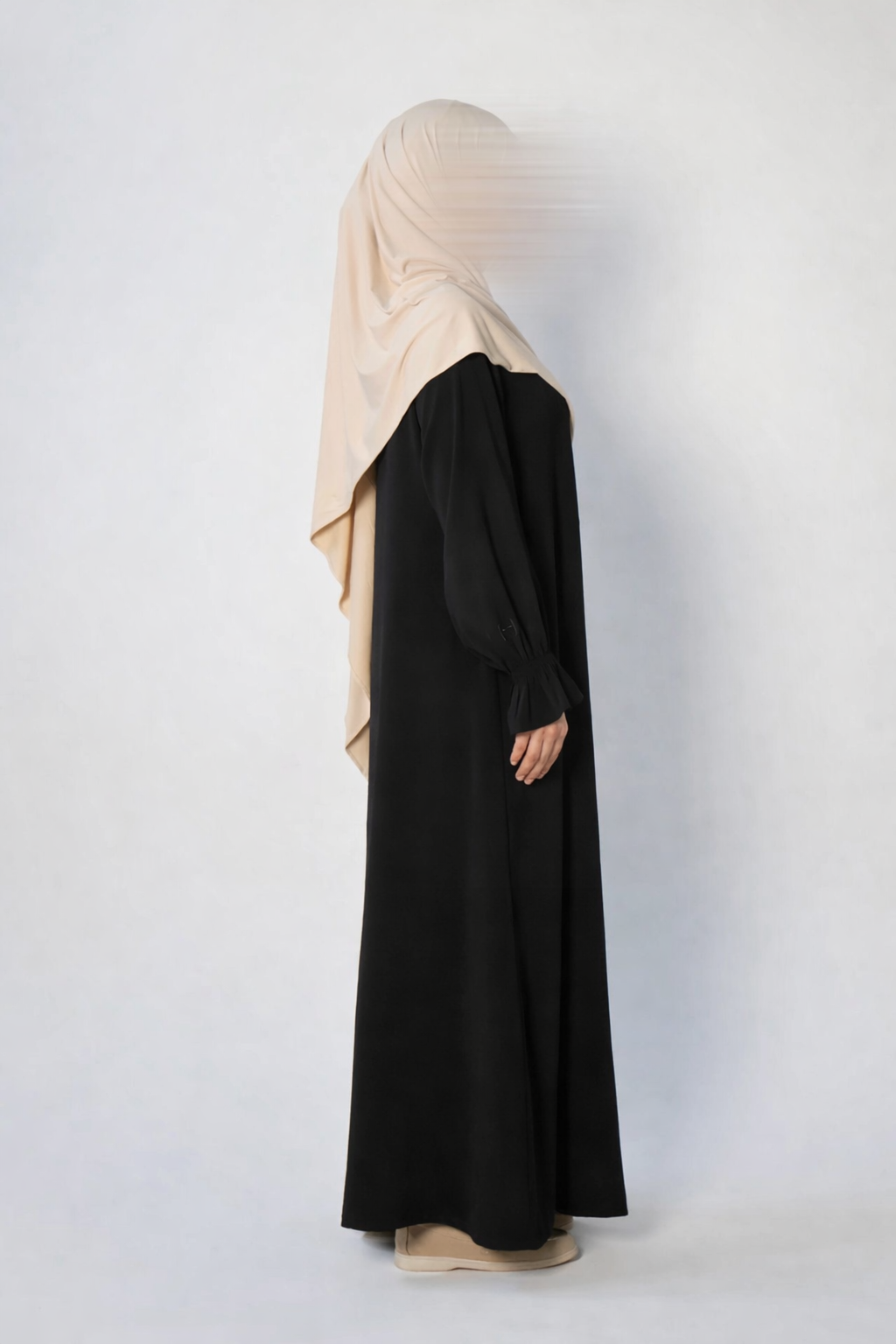 Essential poet sleeve style closed abaya in BLACK. Stitched with a protected neckline for durability and two side slit pockets