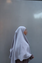 Essential diamond cut style khimar in LIGHT GREY. Stitched with a doubled up head tie band for durability and security when tied, as opposed to a standard khimar which has only one layer of fabric on the head tie region.