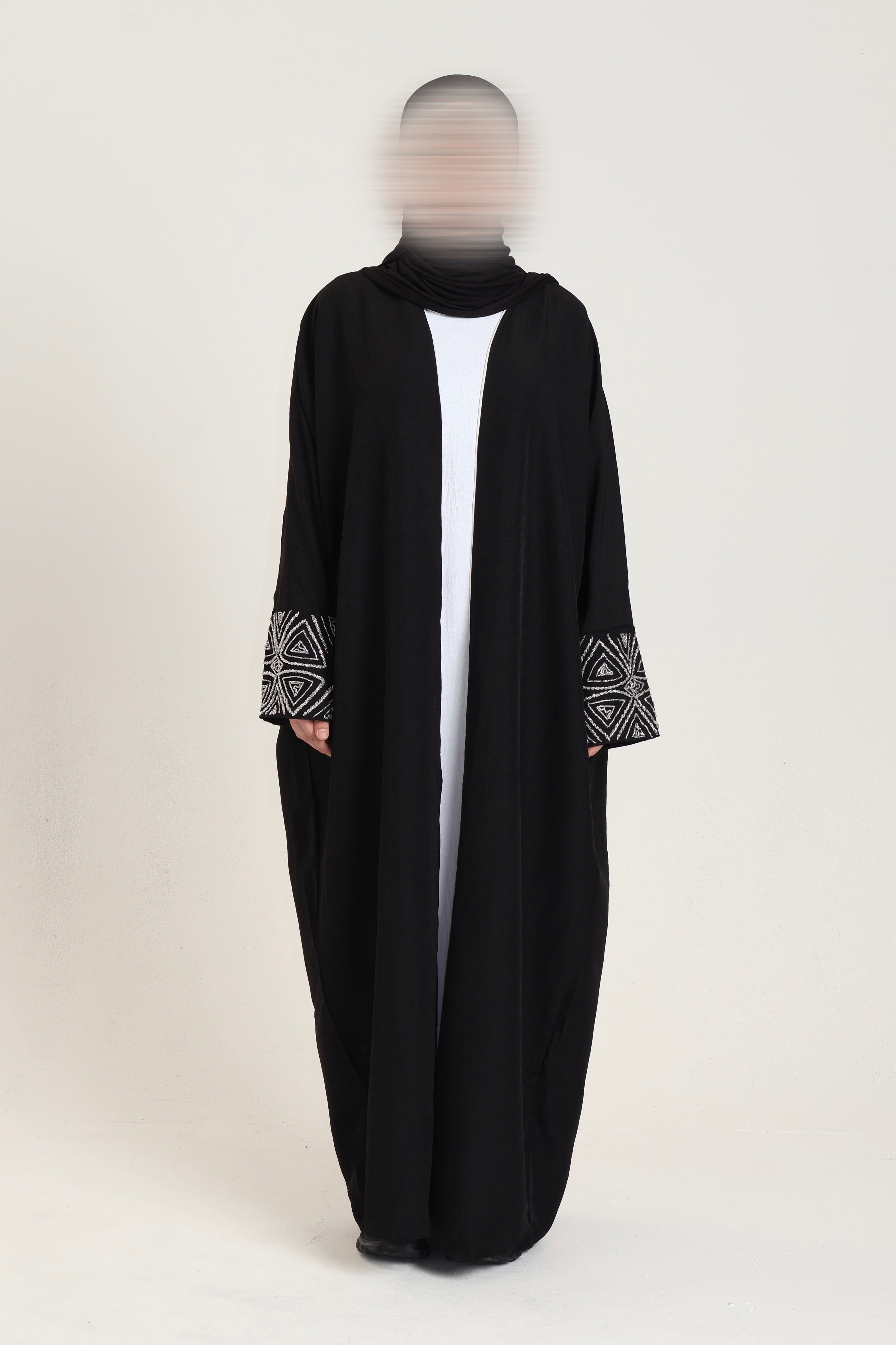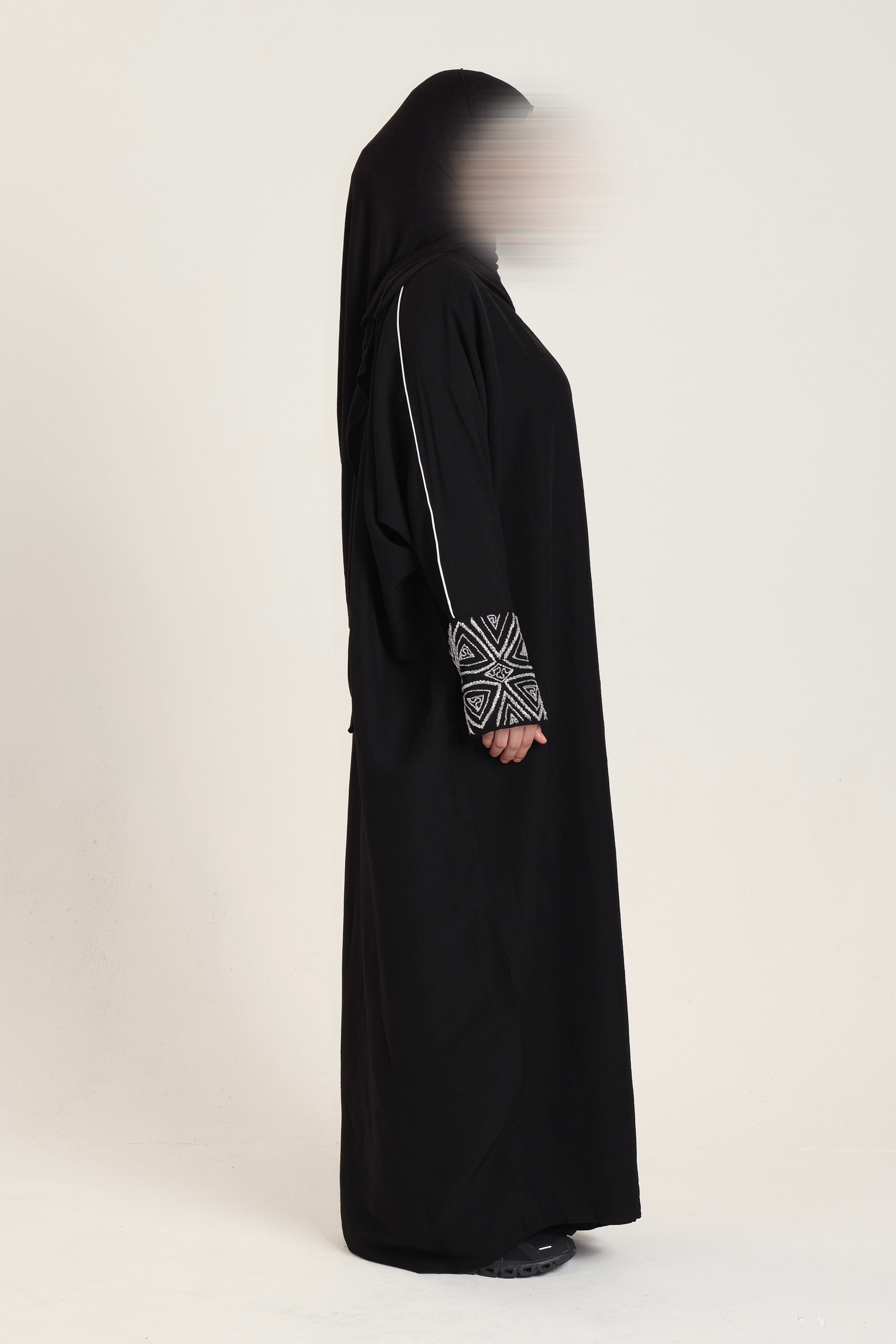 A black abaya with hand-stitched beadwork detailing on the sleeves. Made from a slightly crinkled fabric which is ideal for any weather type.