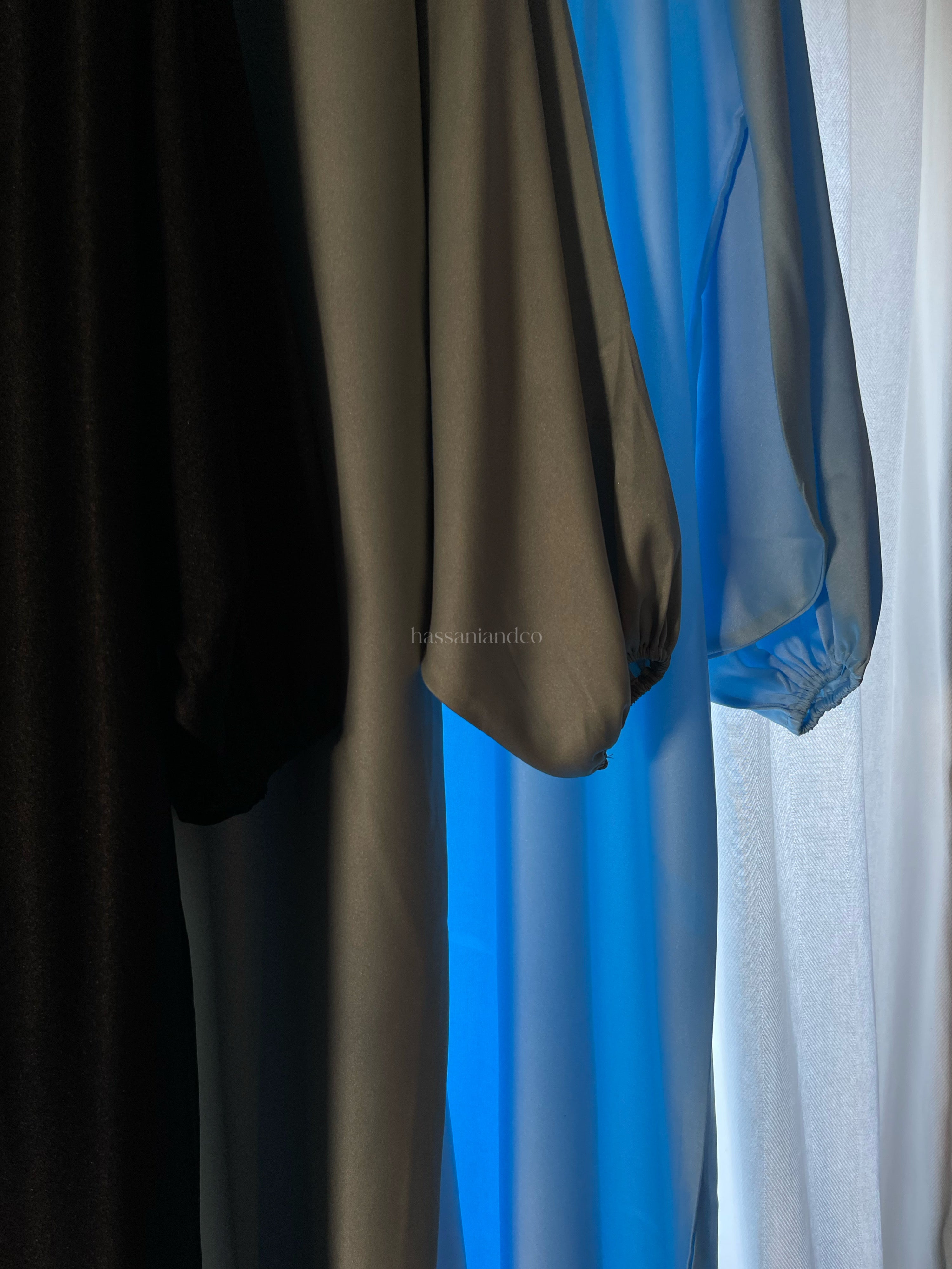 Our luxe, Eid collection featuring 3 khimar shades; Pearl green, Jasmin blue and Black