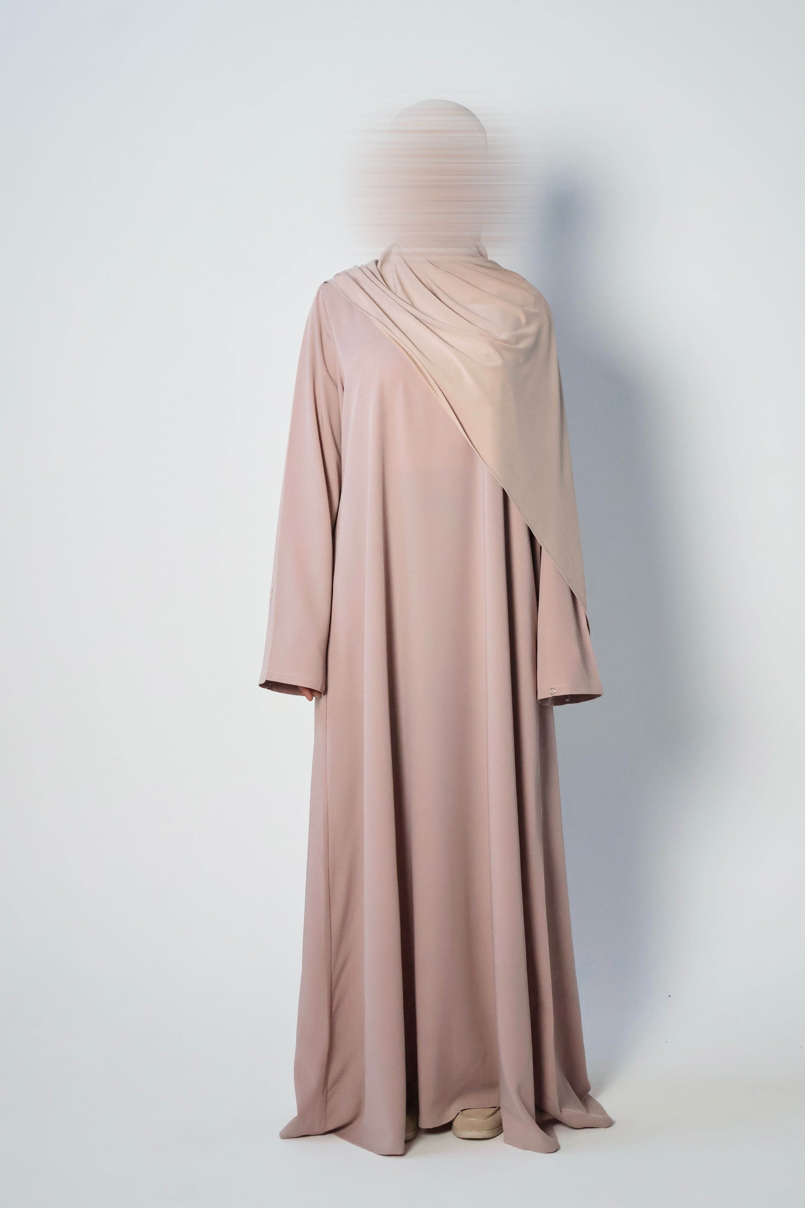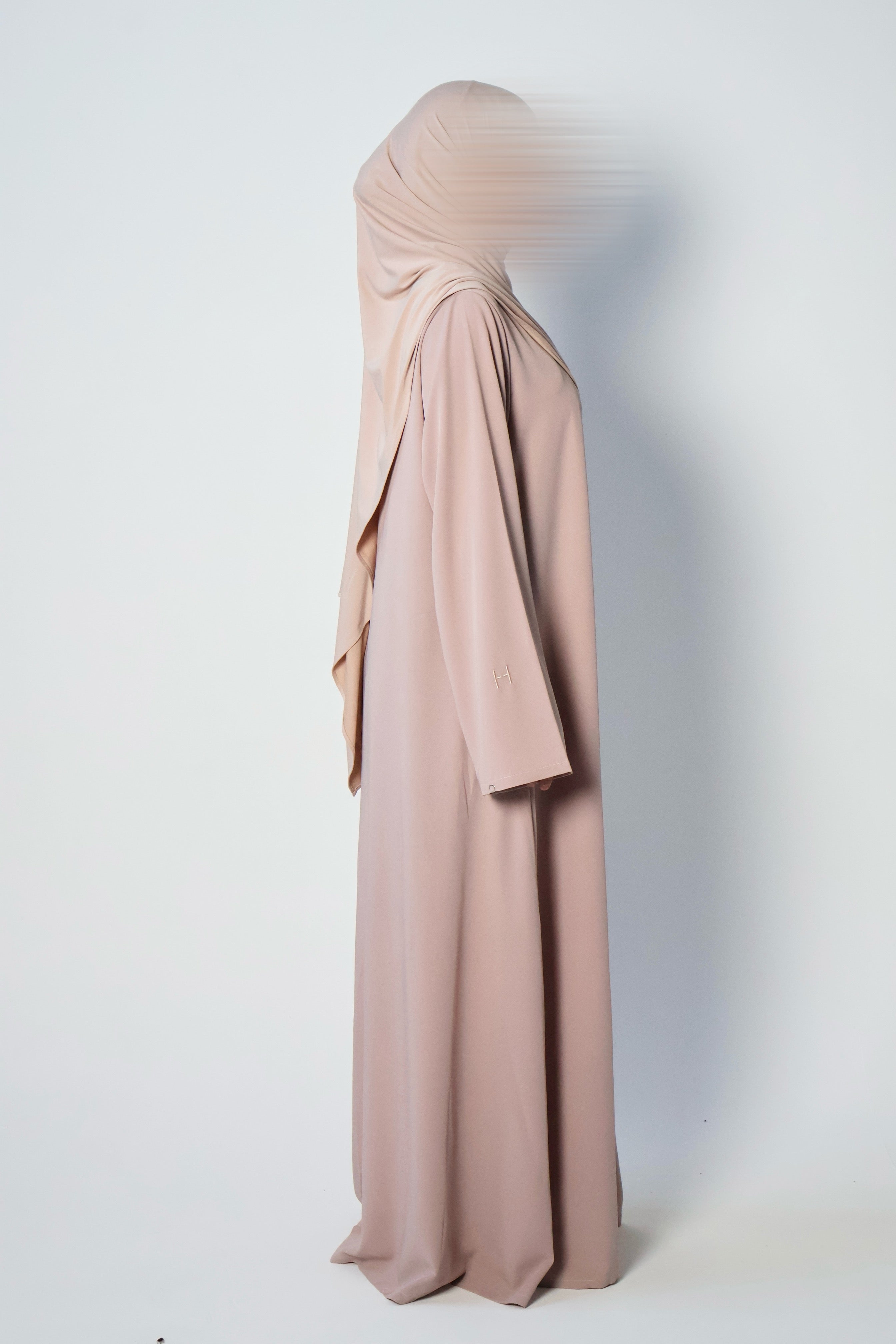 Essential everyday style closed abaya in BABY PINK. Stitched with a protected neckline for durability and two side slit pockets. Both sleeves feature a popper button to prevent it from sliding, ensuring extra modesty