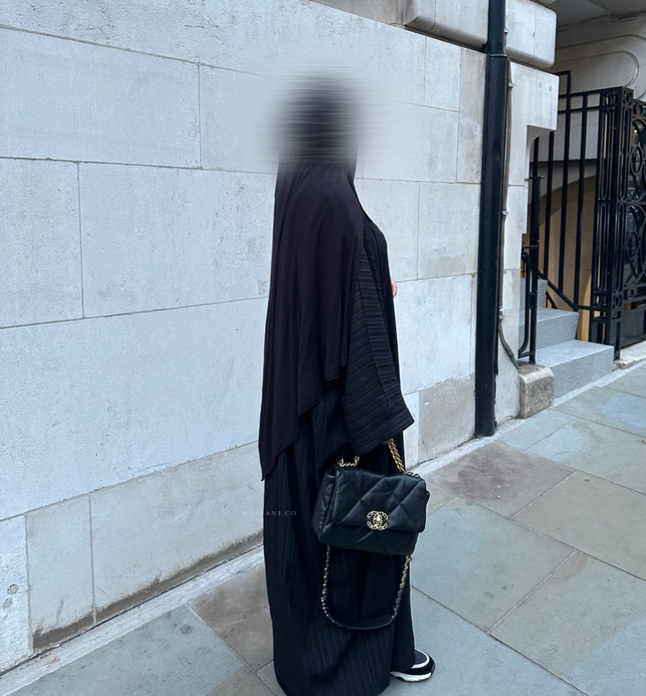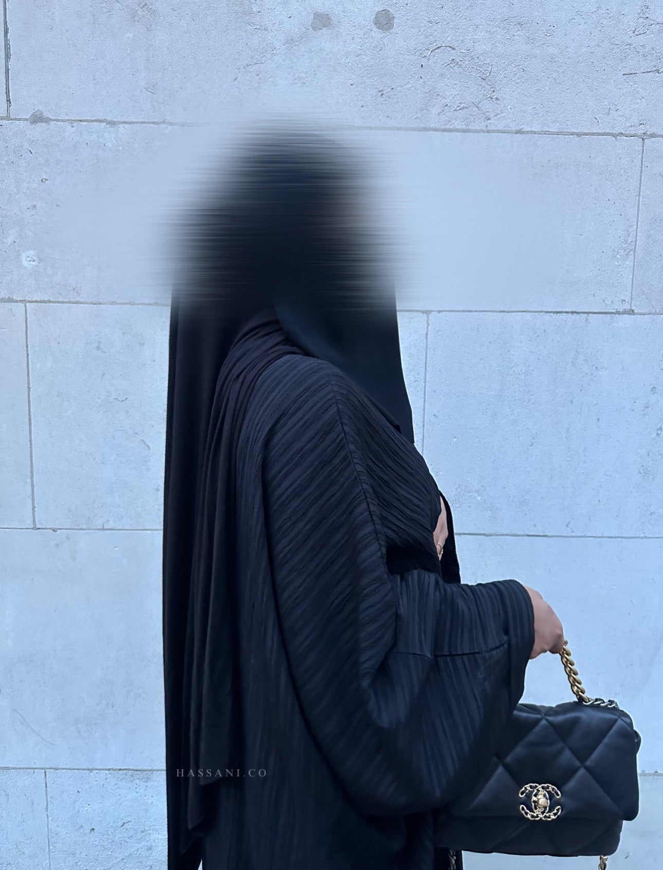 Please note this is an OPEN abaya which can be worn as a wrap style, and does not come with buttons. Comes complete with a matching chiffon hijab