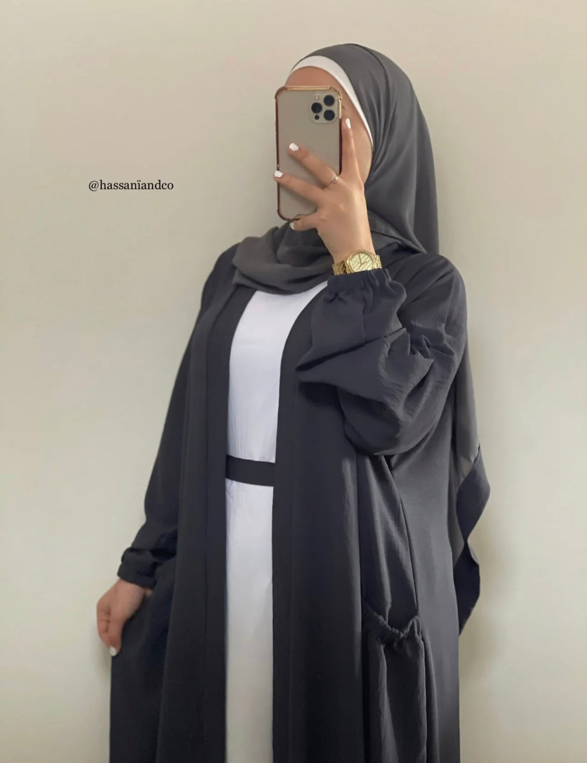An open abaya, made with stretchy, soft crepe like fabric for maximum comfort and cuffed sleeves. This abaya also features two side pockets for extra convenience! A very unique charcoal abaya with blue undertones