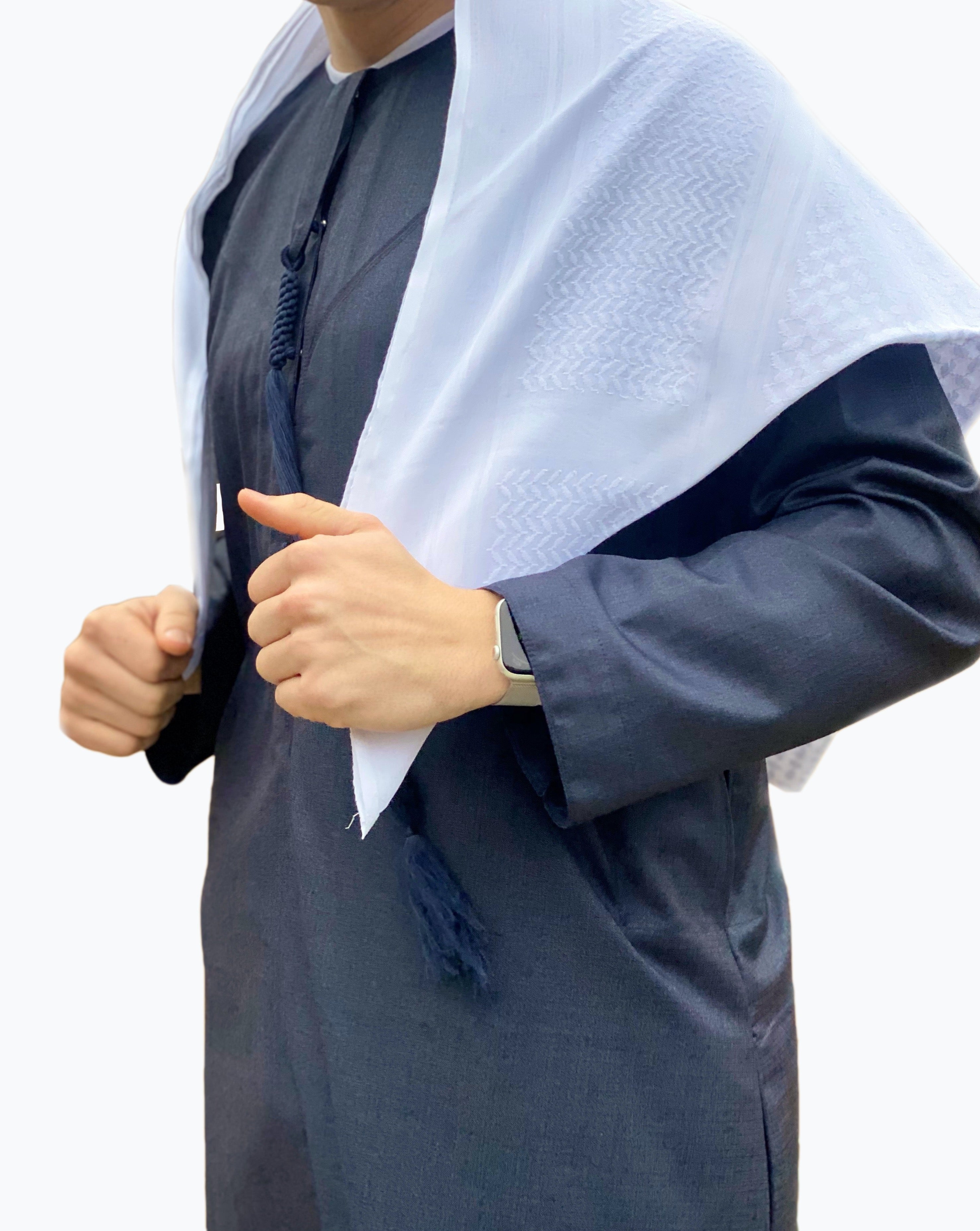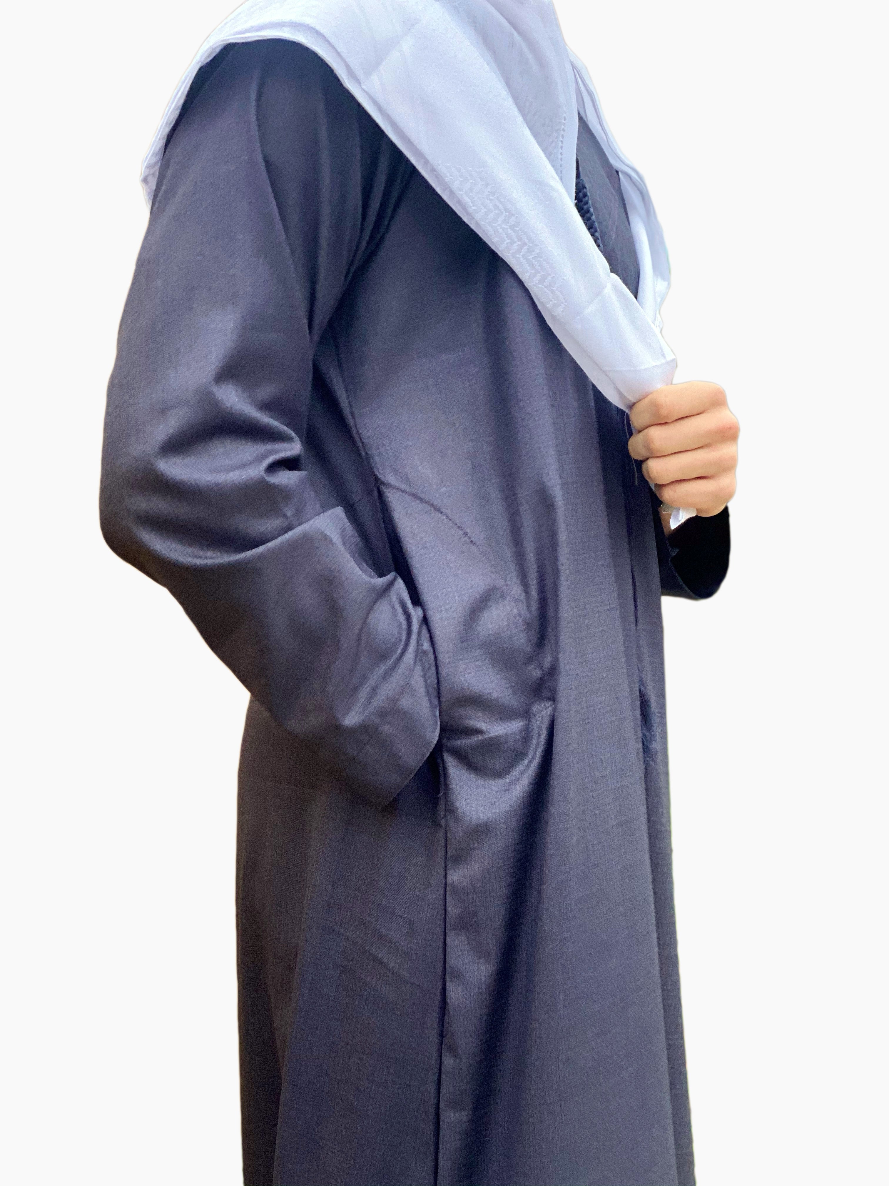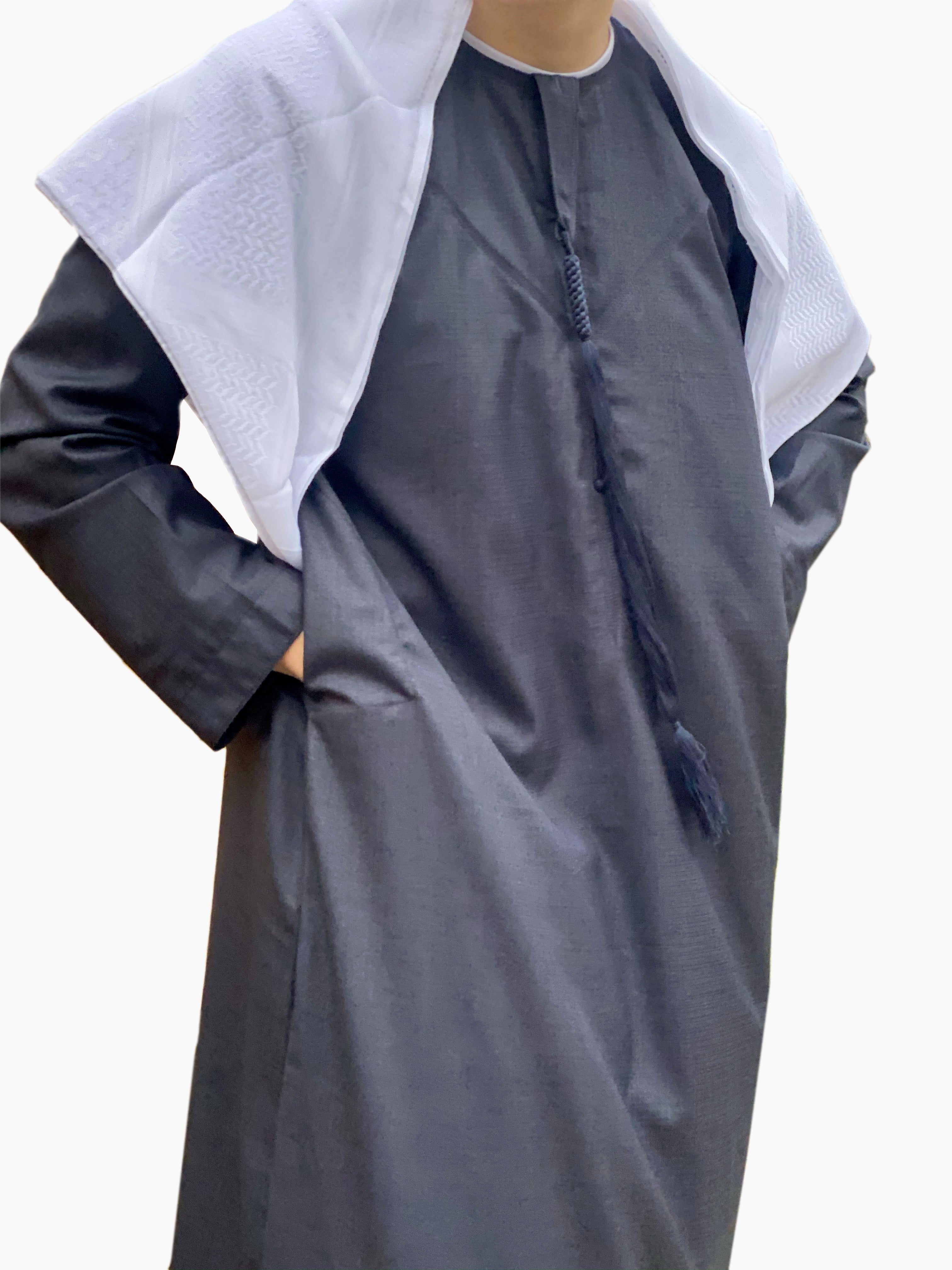Our smart, Blueish Grey Emirati style thobe. Includes a removable tarboosh (tassel) and pockets on both sides. Perfect for occasional wear, especially during the winter season. Available in multiple sizes