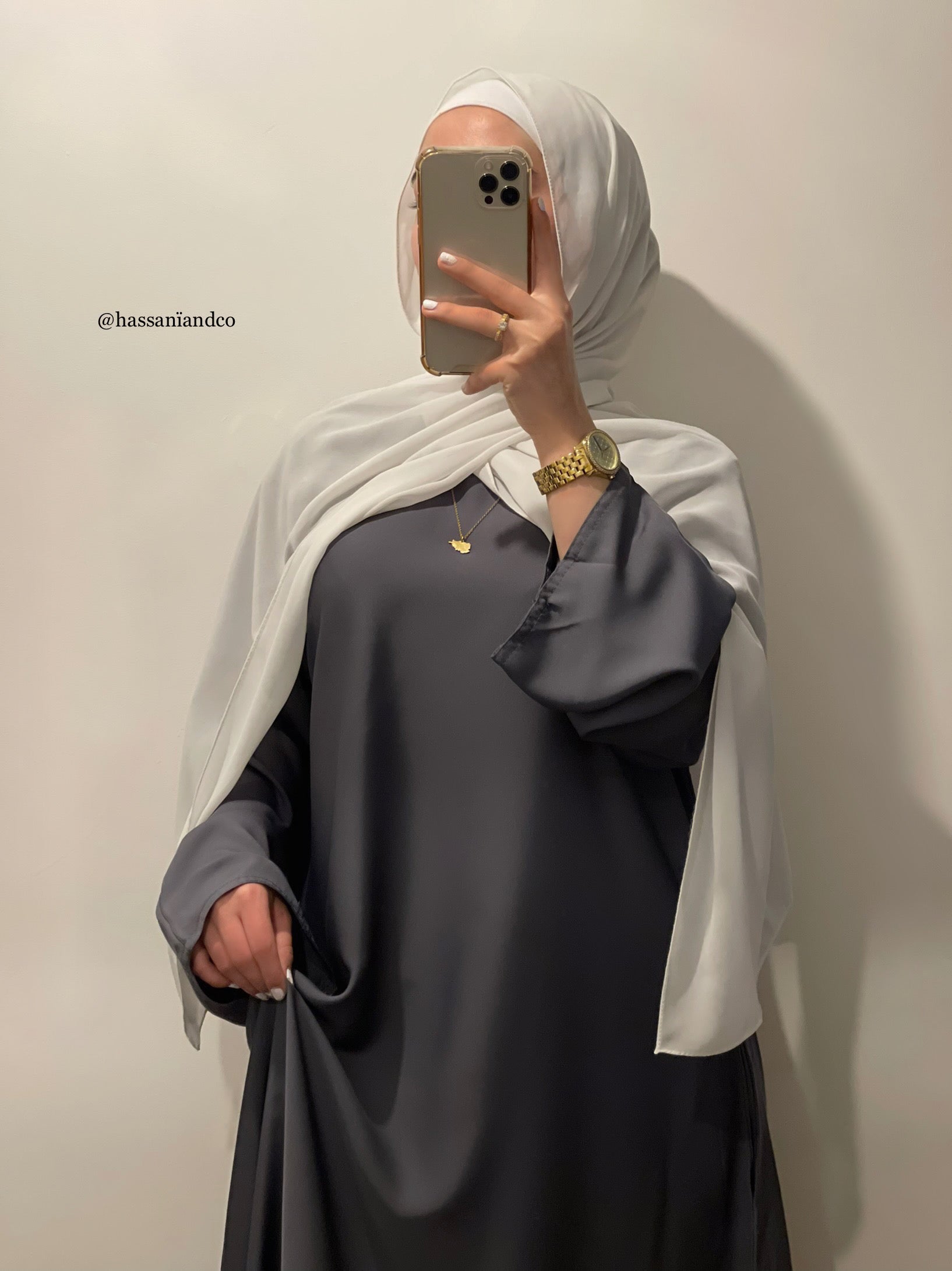 Our straight cut, yet loose fit ash grey abaya. A beautiful dark grey colour. Tailored with wide sleeves fitted with a hidden button inside to give you the option of preventing the sleeve from sliding as well as a side slit pocket, for day to day convenience!