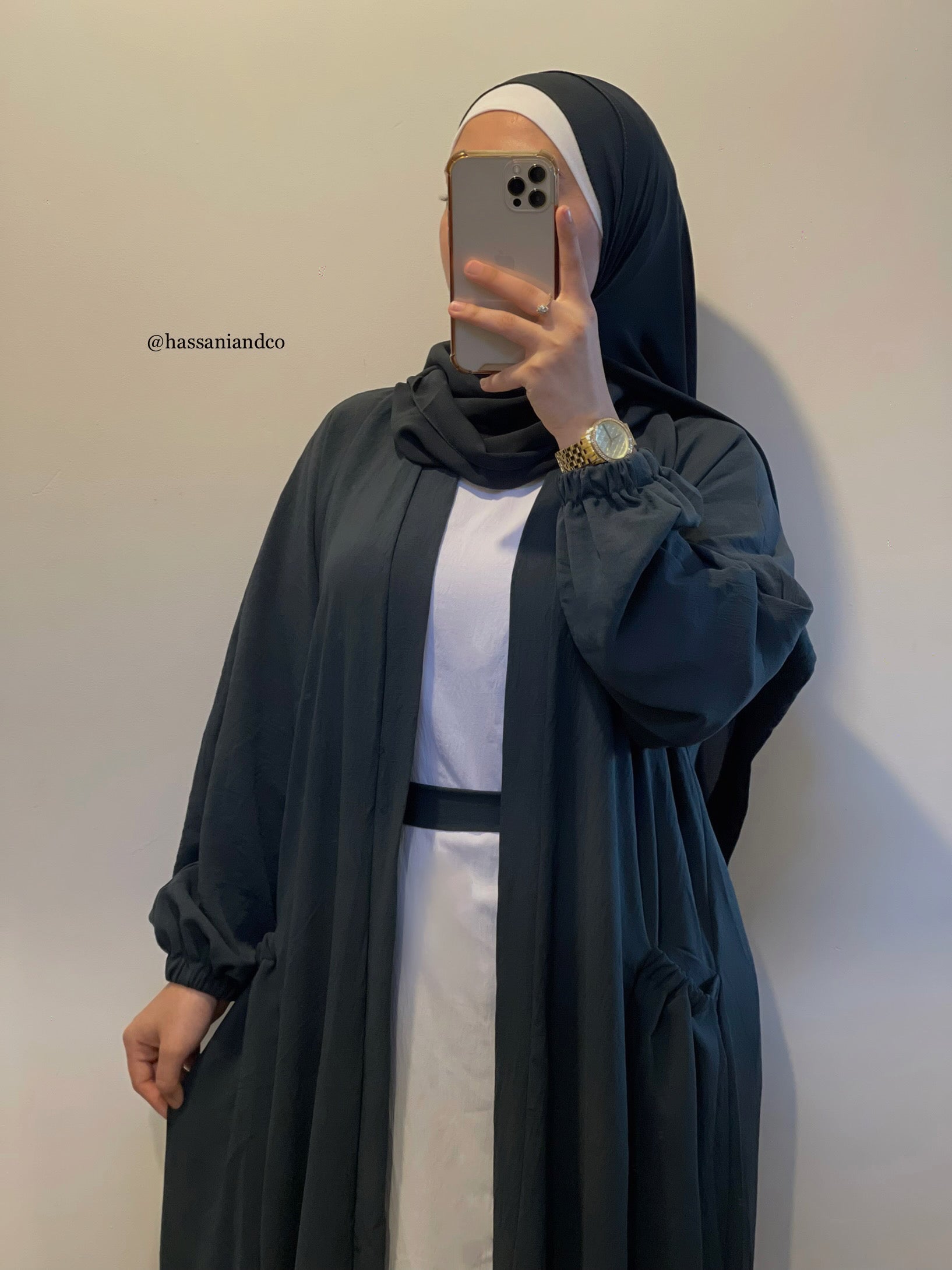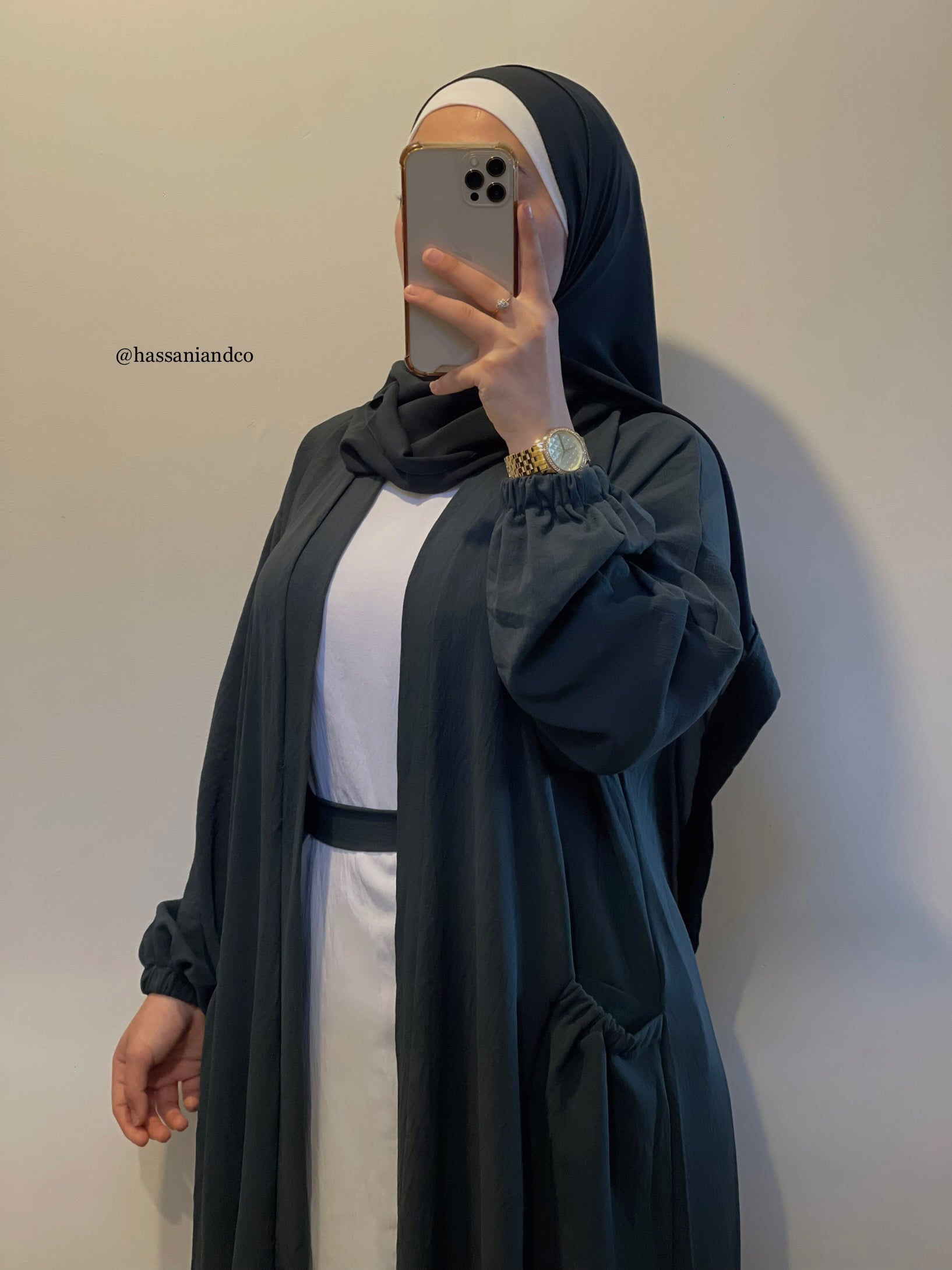 An open abaya, made with stretchy, soft crepe like fabric for maximum comfort as well as side pockets for extra convenience!