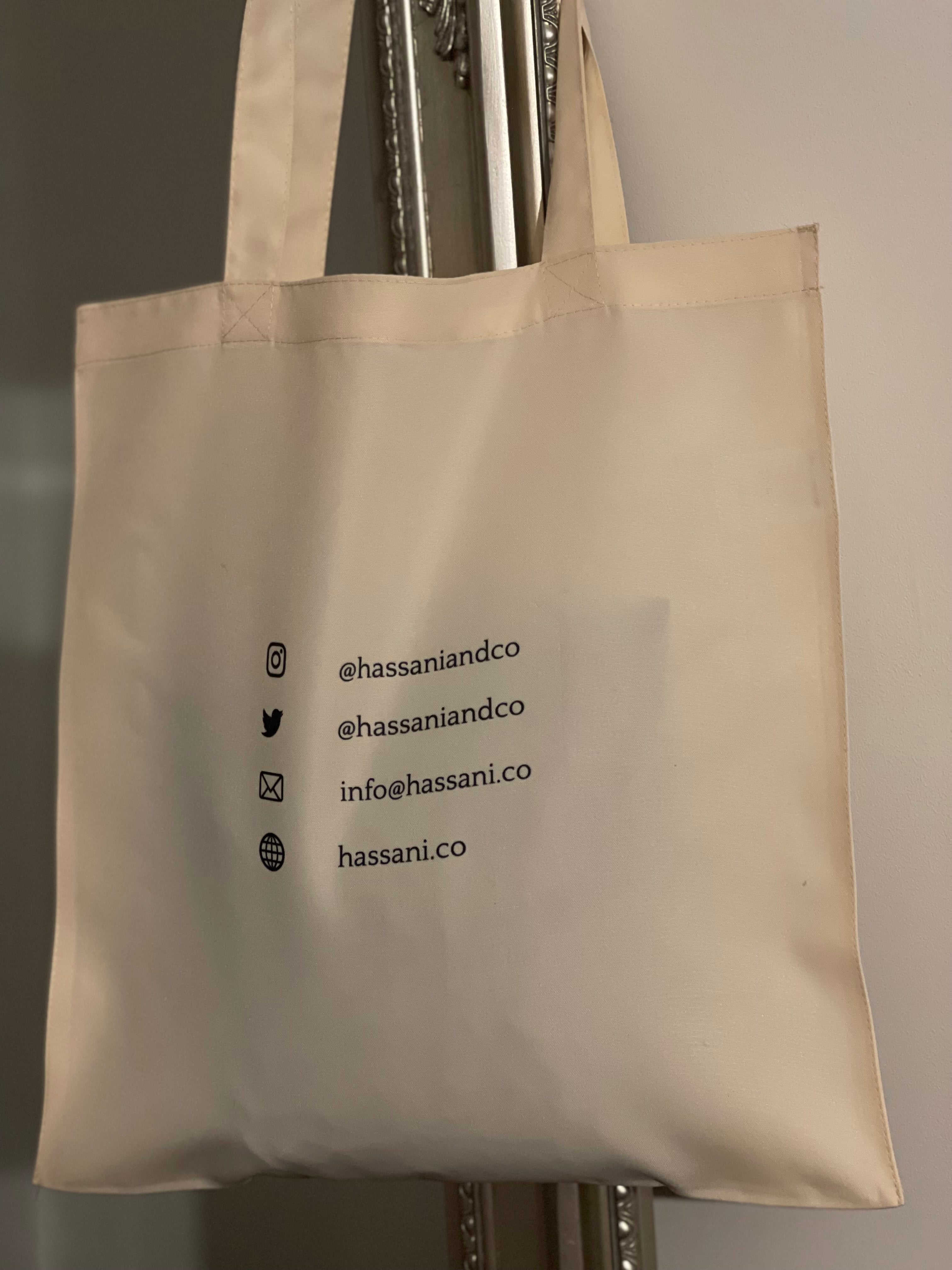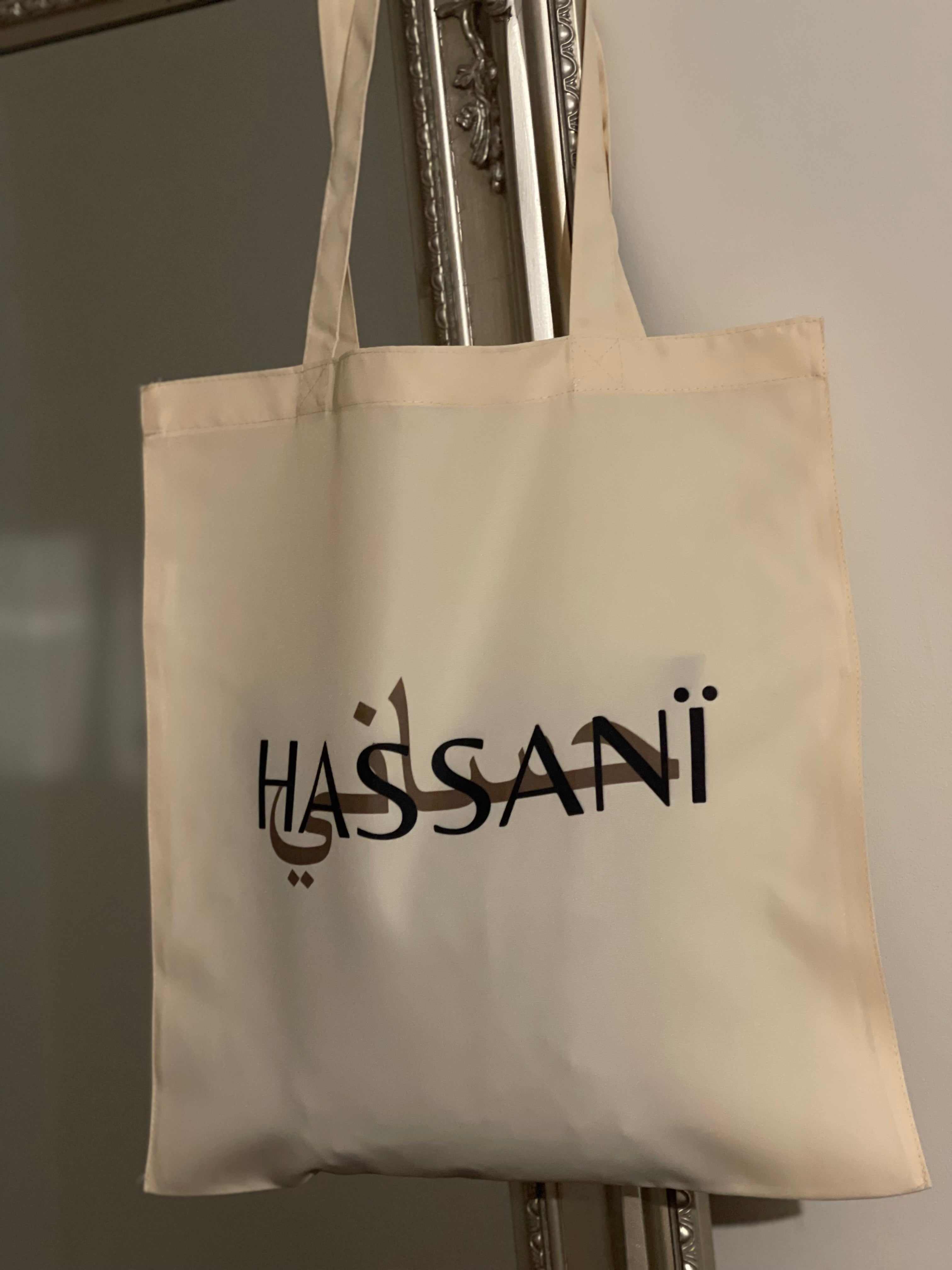 Our Hassanï totes: A sustainable, perfect accessory to complete your outfit! Ideal for everyday use, they are made from an eco friendly polyester fabric which is designed to last you a while, allowing it to be a long term accessory in your wardrobe!
