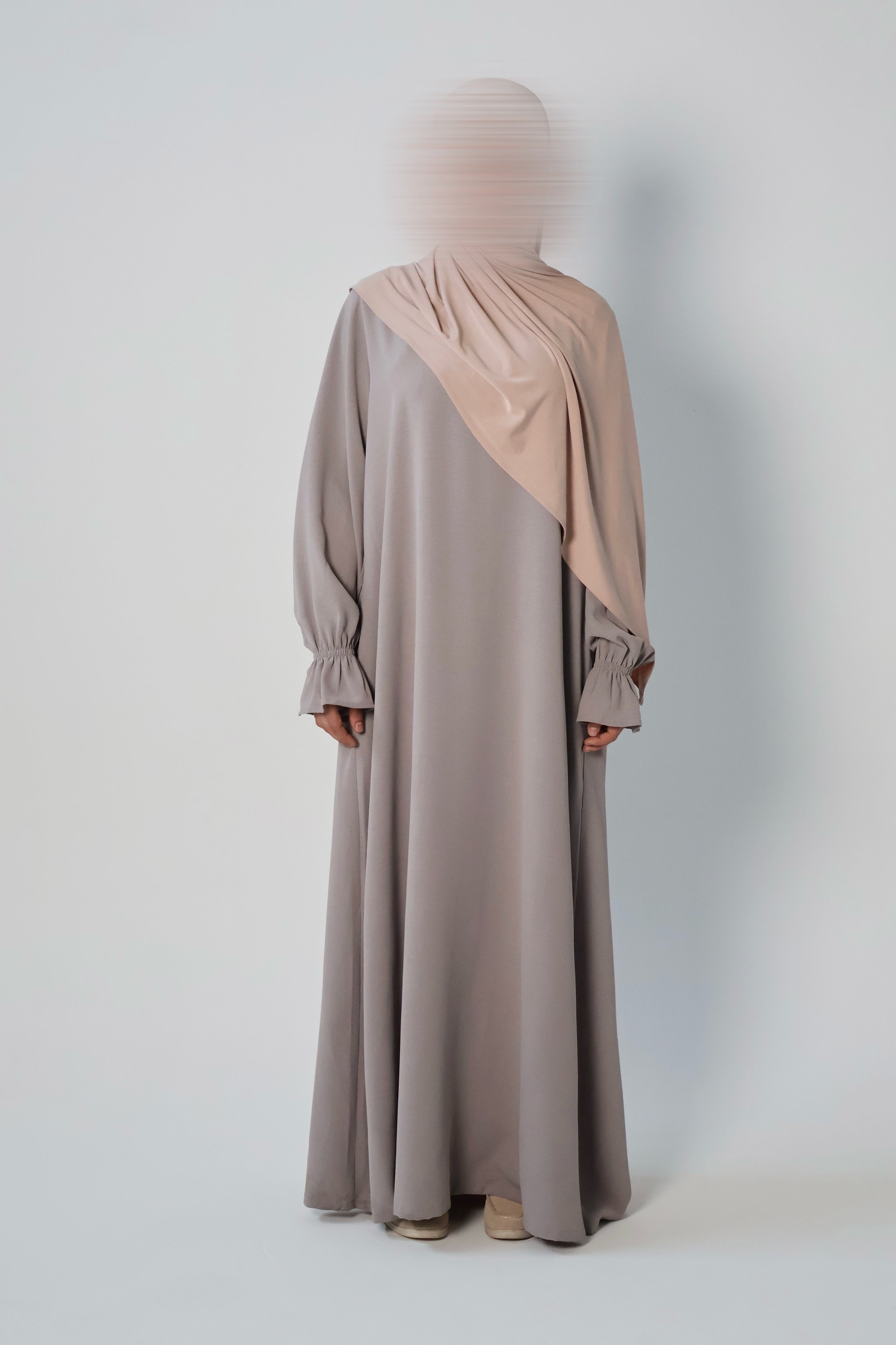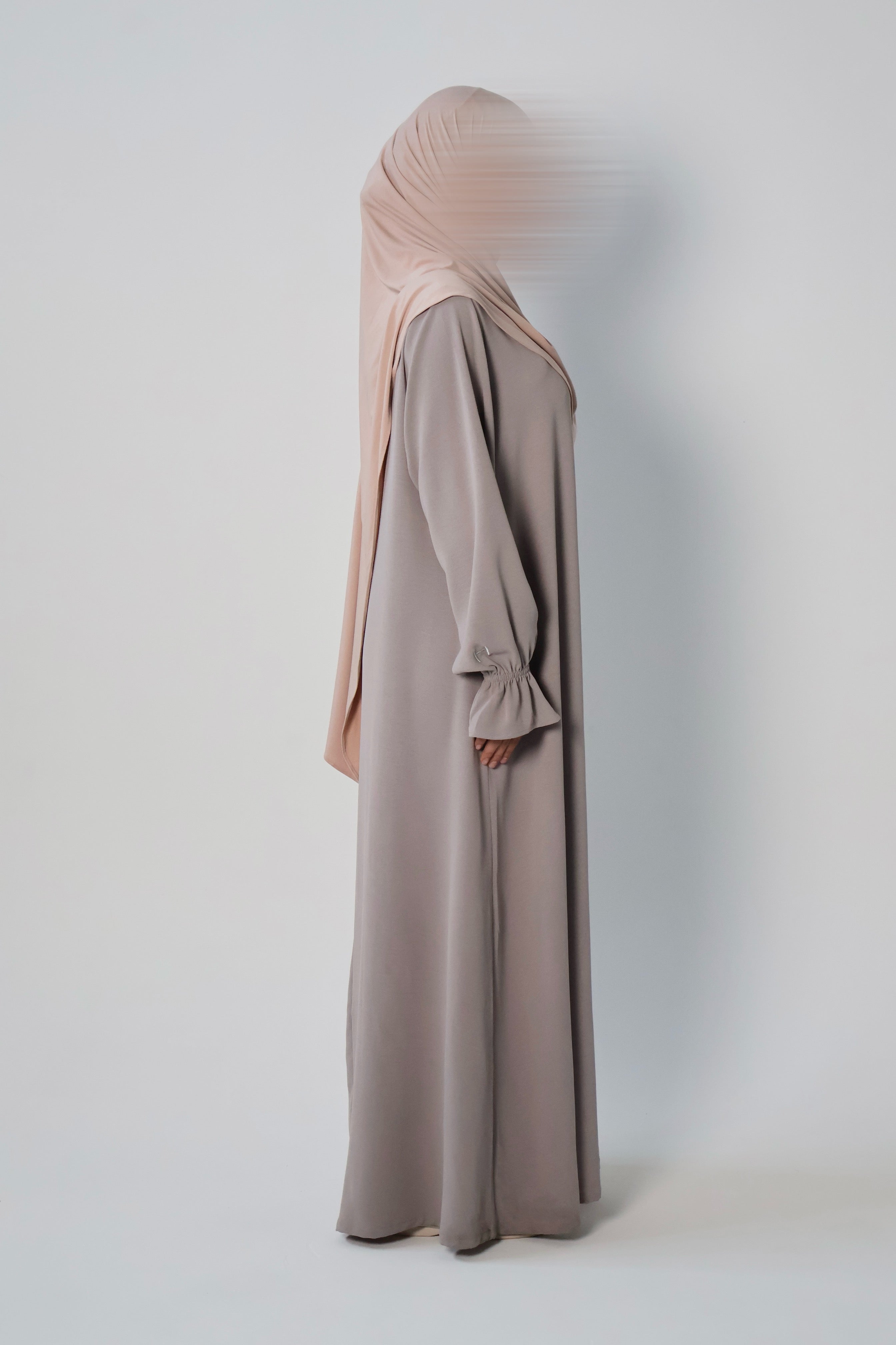 Essential poet sleeve style closed abaya in LAVENDER GREY. Stitched with a protected neckline for durability and two side slit pockets