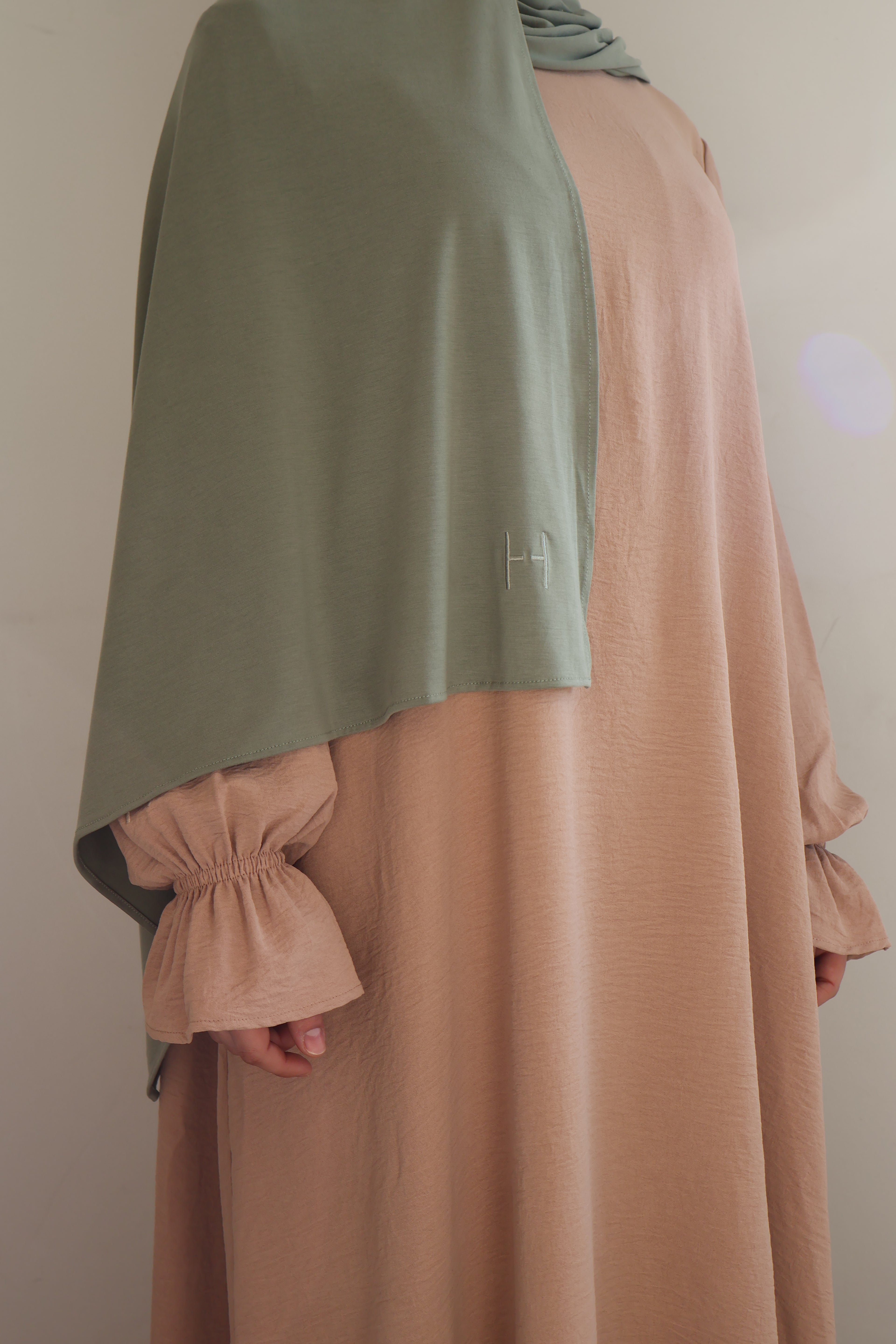 The matcha green, HASSANI breathable jersey is made from high-quality modal, which feels exceptionally soft against the skin. Its breathable fabric allows airflow while helping to prevent hair damage.