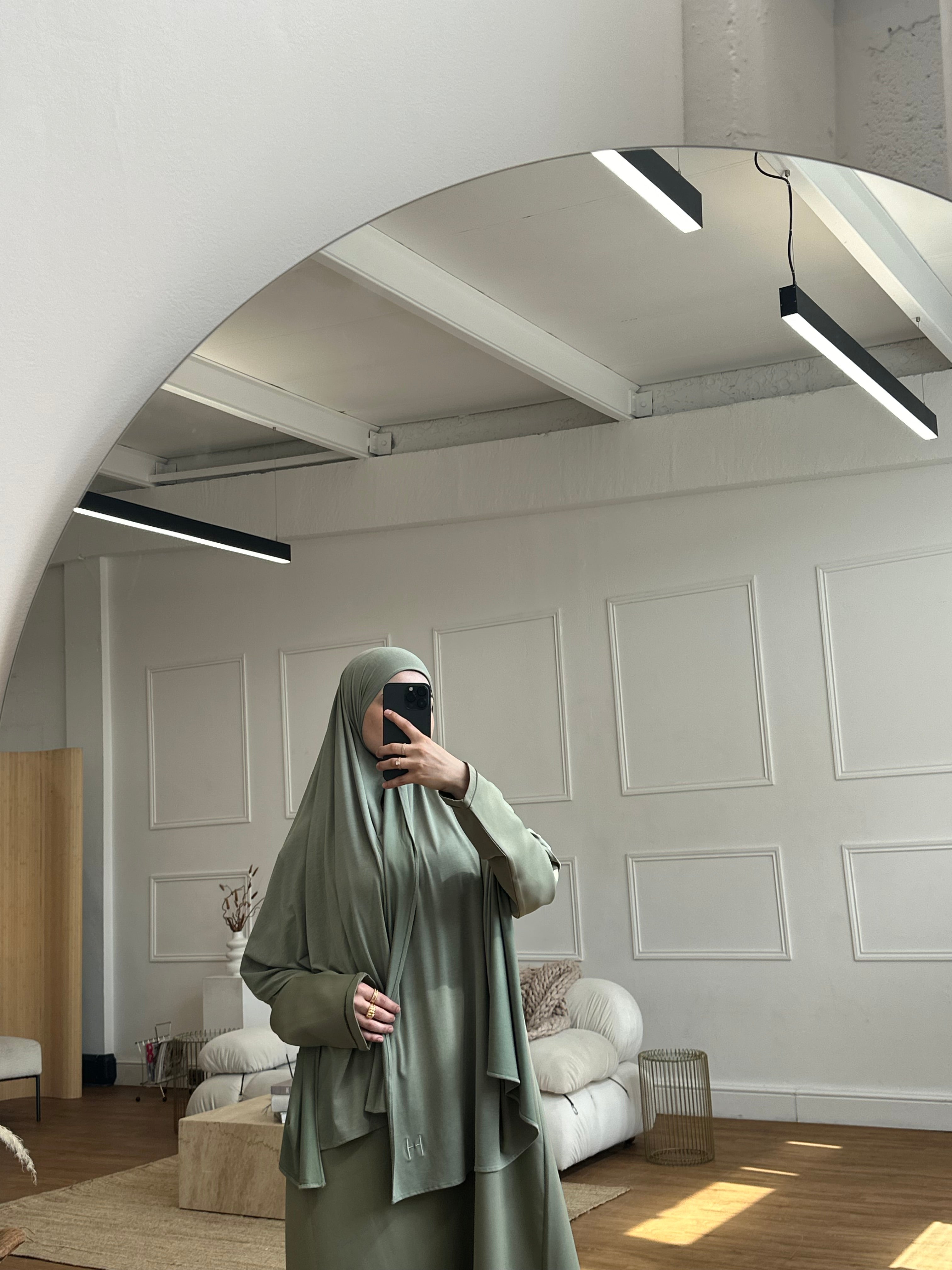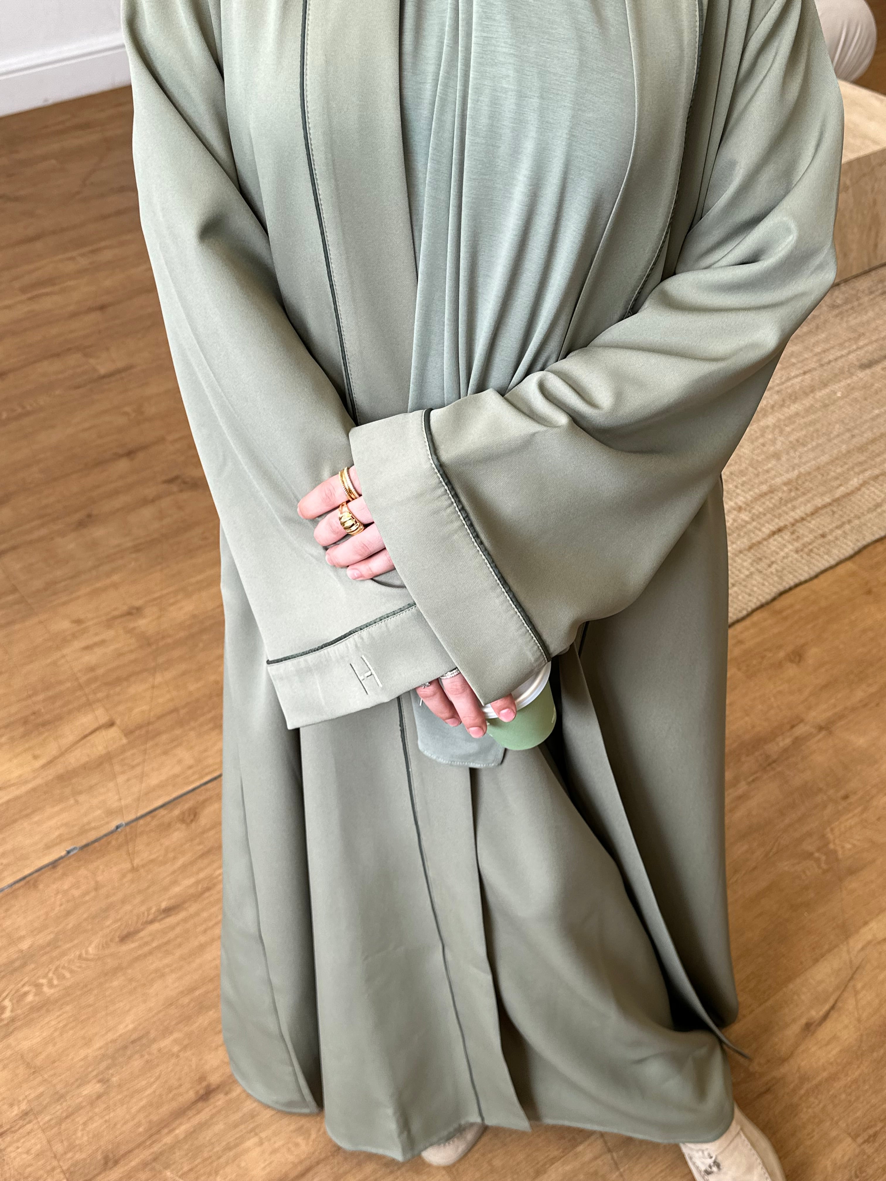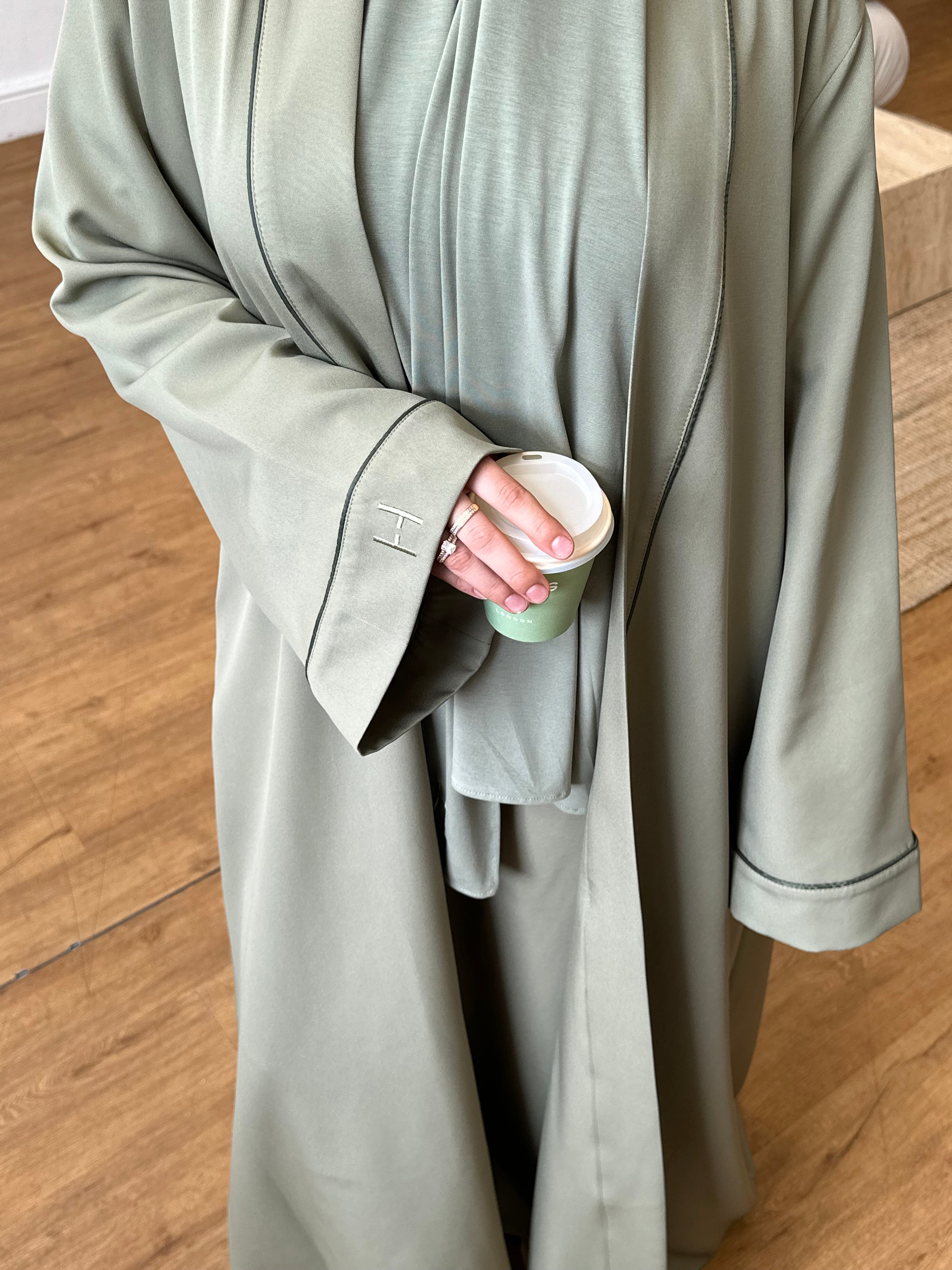 Comprised of a fitted inner slip abaya with clean long sleeves and a streamlined silhouette. Over it, the outer abaya drapes effortlessly; oversized, open-front, and detailed with wide sleeves, two discreet side pockets, and tonal piping that runs the length of the body and sleeves. Finished with our subtle H embroidery for a signature touch.