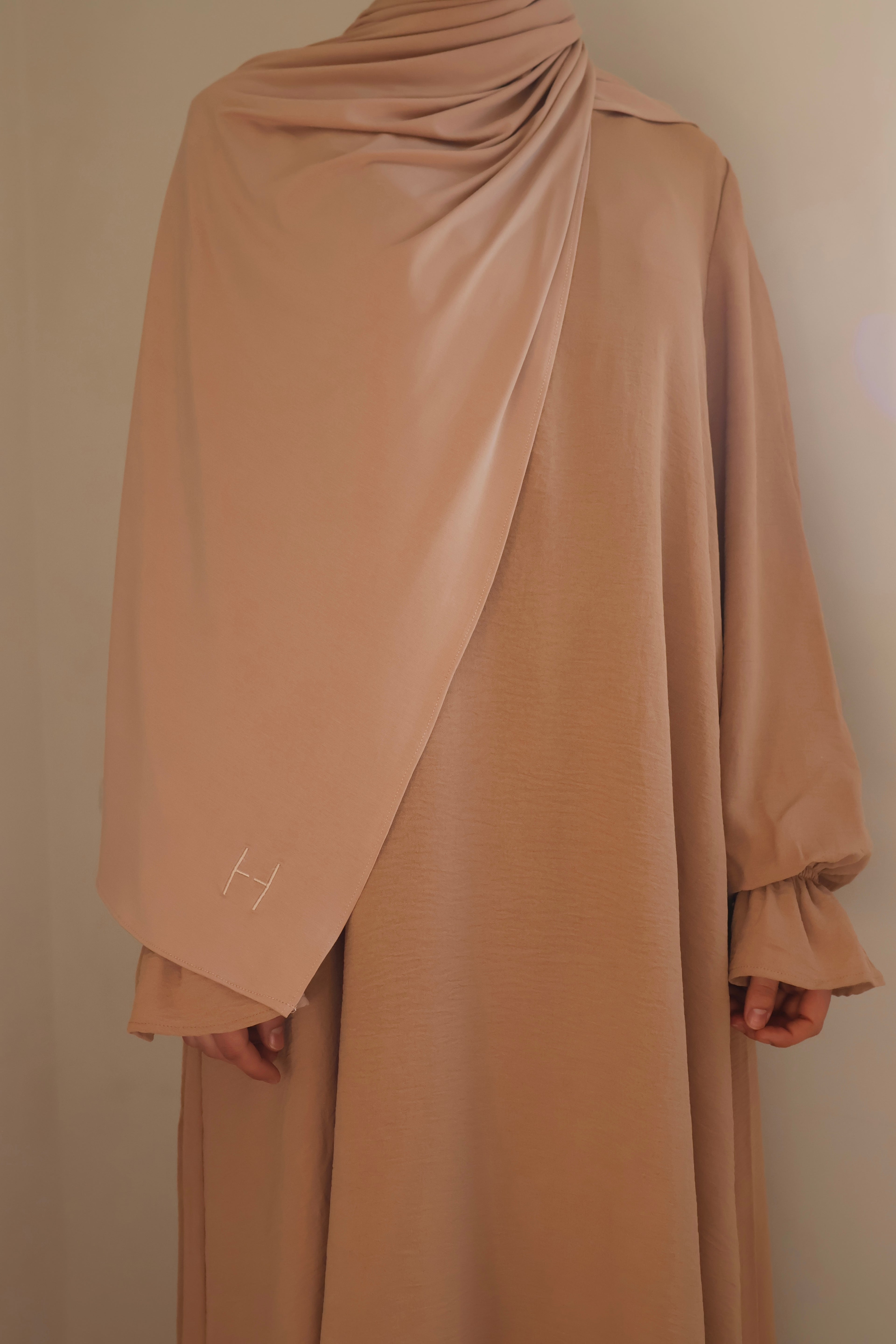 Our breathable jersey scarves are made with a carefully seamed edge for a clean look, as well as having 2 clear sides; the outer side is the one shown when worn and the inside is slightly matted. Each scarf is complete with our signature H embroidery in one corner.