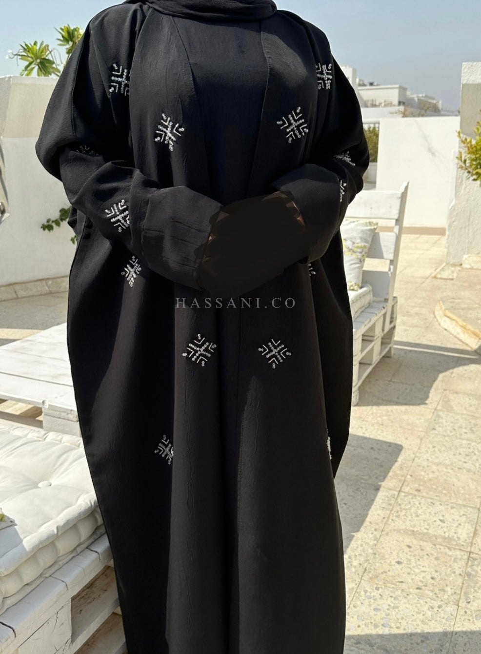 A showstopper black abaya with stunning hand-stitched star like, beadwork detailing on the sleeves! Made from a slightly crinkled fabric which is ideal for any weather type.