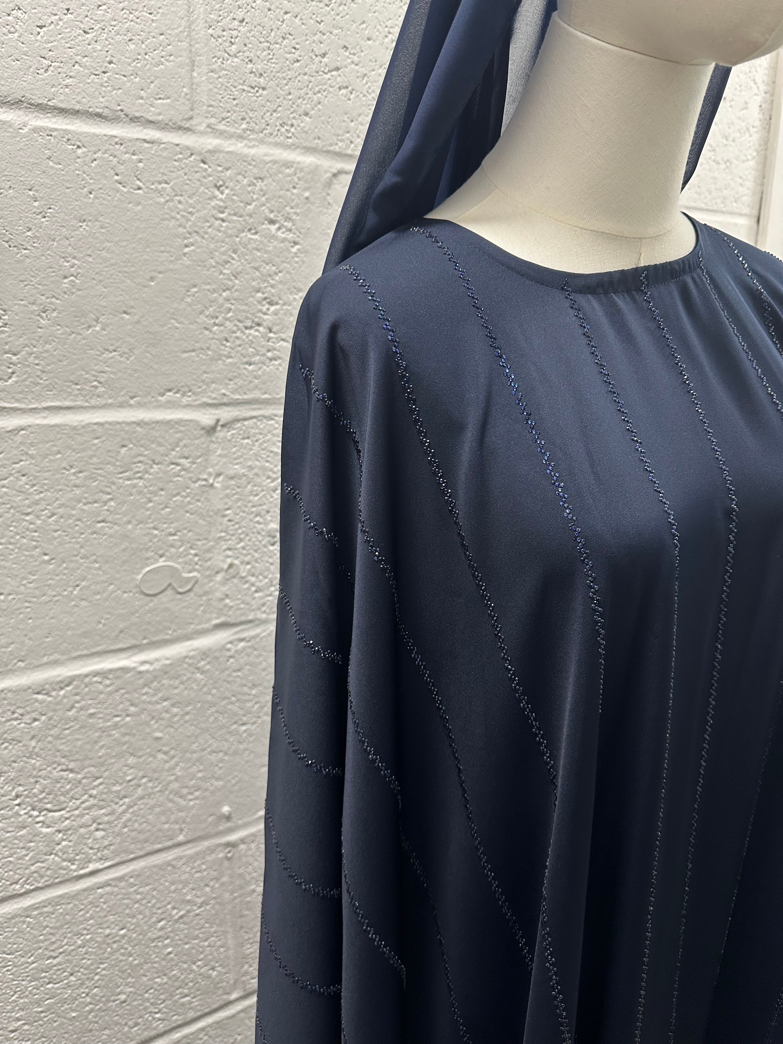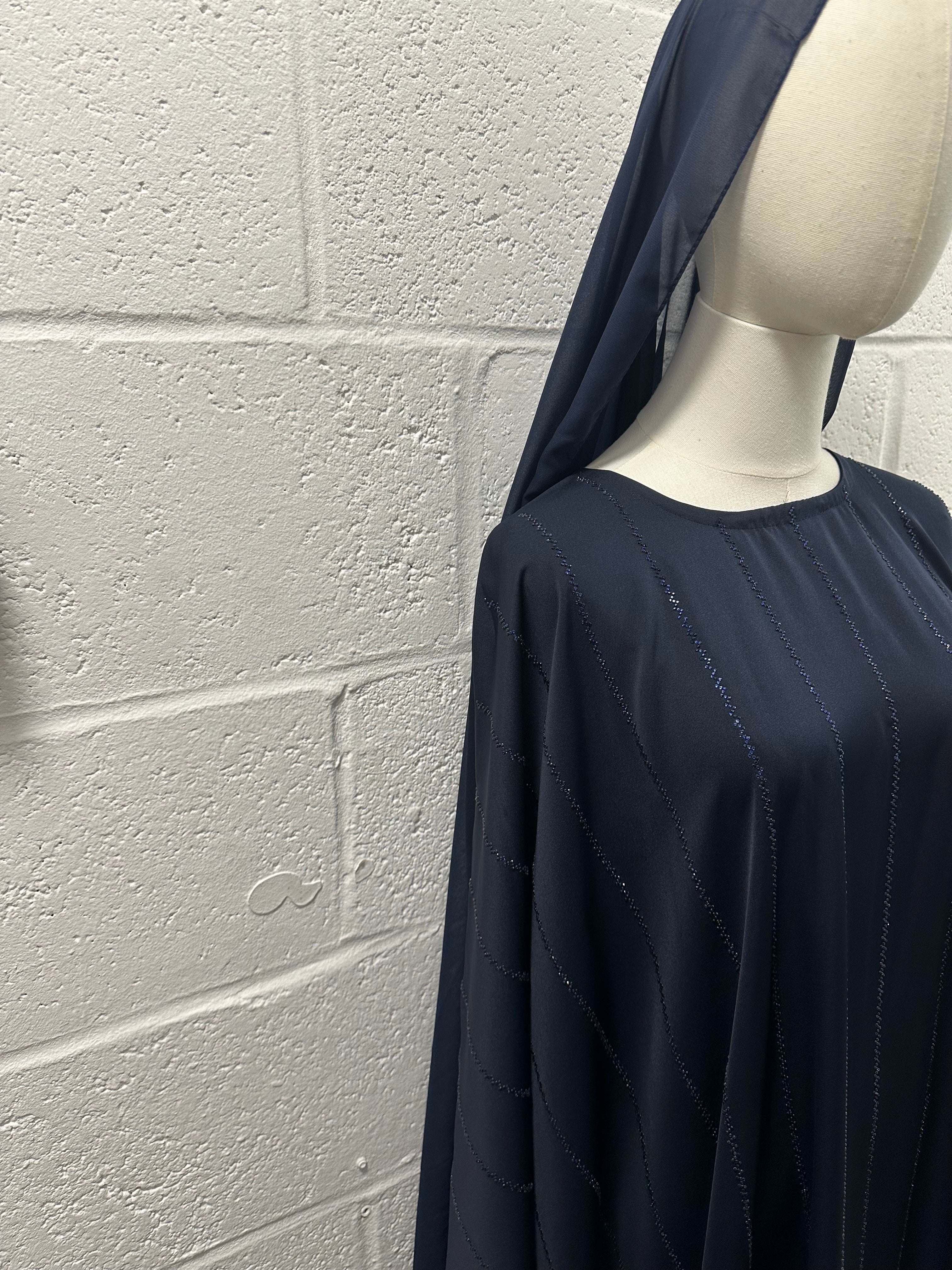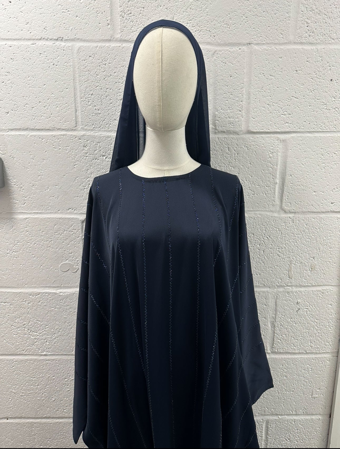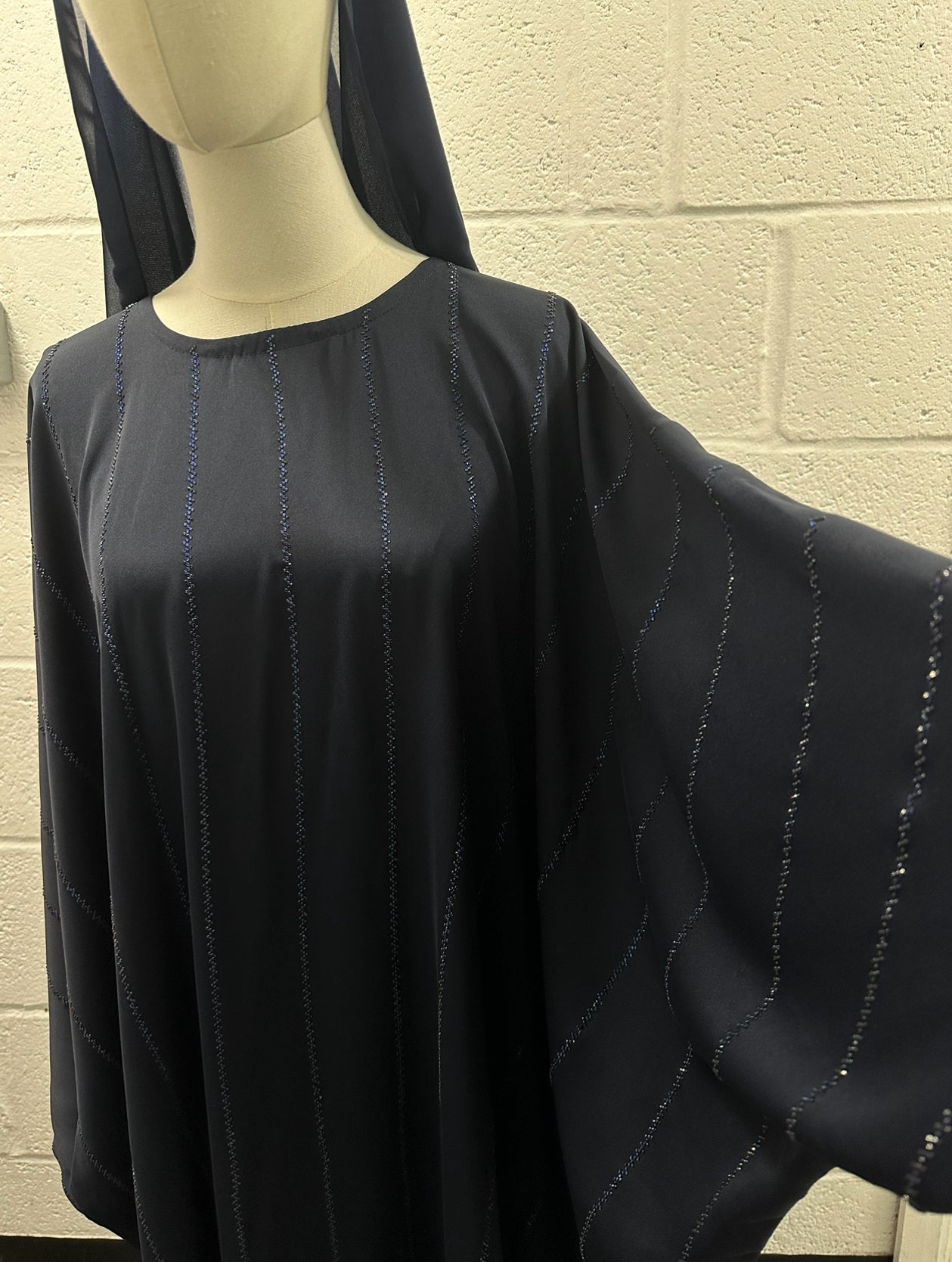 Beautiful navy butterfly style abaya in nidha, with gem detailing across the front and sleeves - comes with a matching scarf with gem detailing on the end of the scarf. The perfect modest piece for a special occasion!