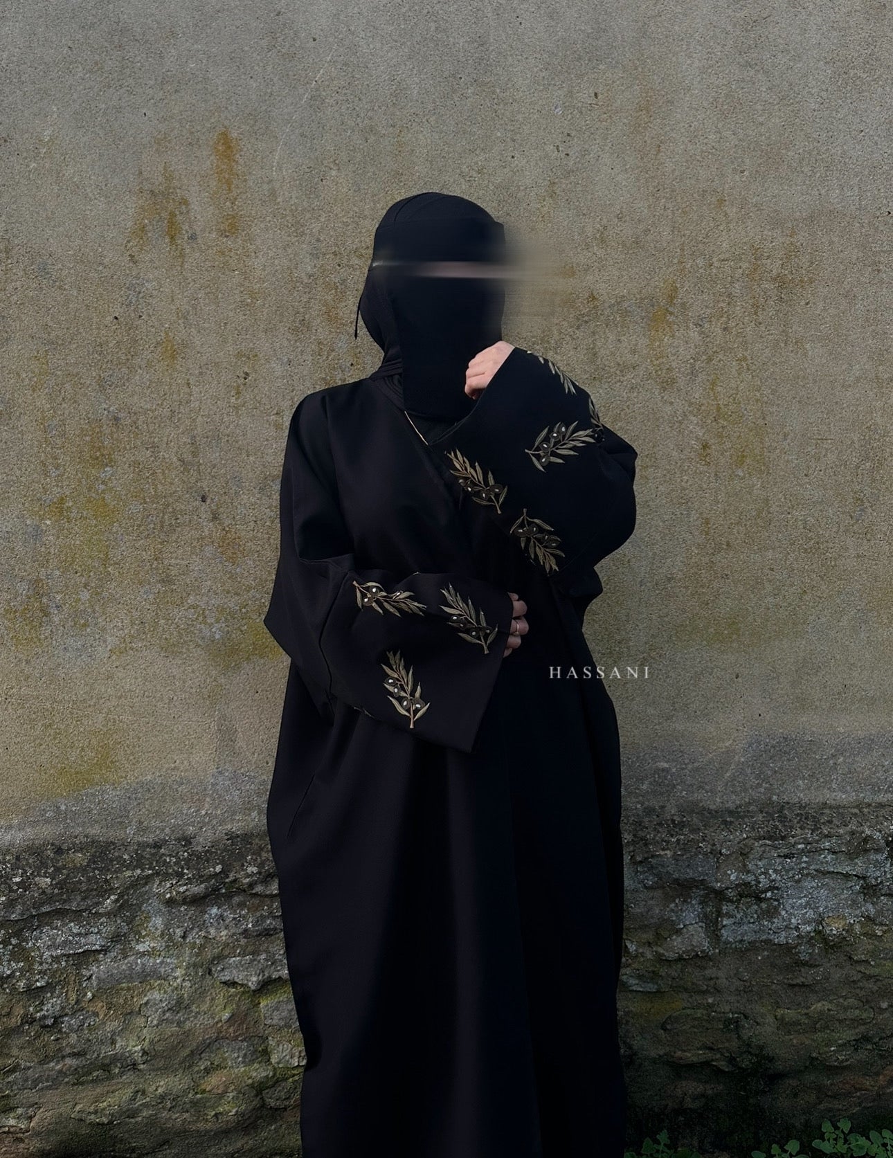 DESIGN UPDATE: OUR PRE ORDER COMES WITH AN ELASTIC BAND ON THE SEAM OF THE CENTRE OF THE ABAYA WHICH IS A TRADITIONAL METHOD OF KEEPING AN OPEN ABAYA CLOSED WHILST WEARING IT OUTDOORS. IT IS WRAPPED OVER THE OPPOSITE SHOULDER, KEEPING THE ABAYA IN PLACE. If you are not fond of this addition, please note it can be easily unstitched/cut and removed!