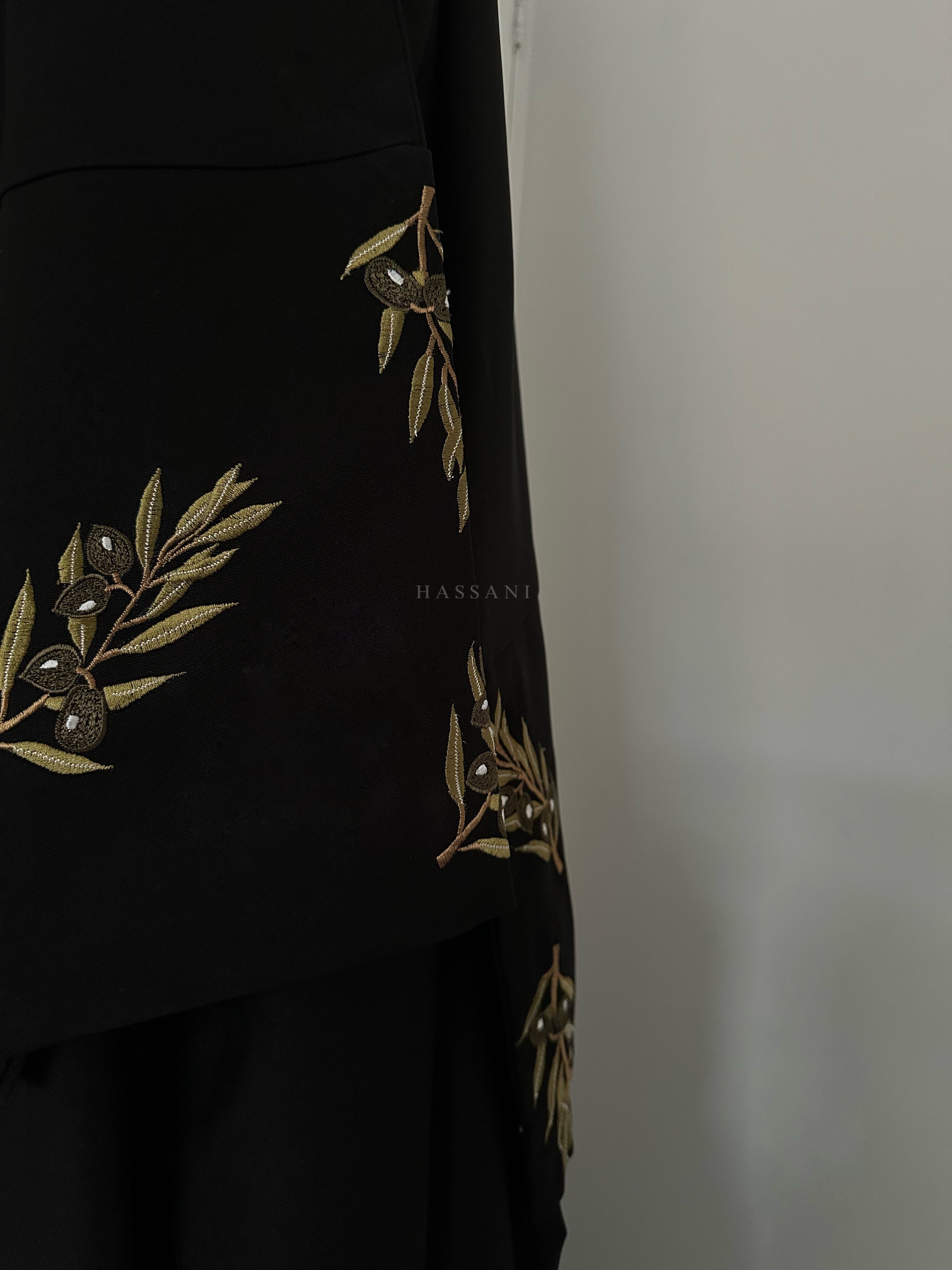 Crafted with care, the intricate design honours the rich cultural heritage, while the use of olive branches conveys a message of the Palestinian people’s strength. This garment stands as a wearable symbol, advocating awareness and empathy for our brothers and sisters in Palestine.