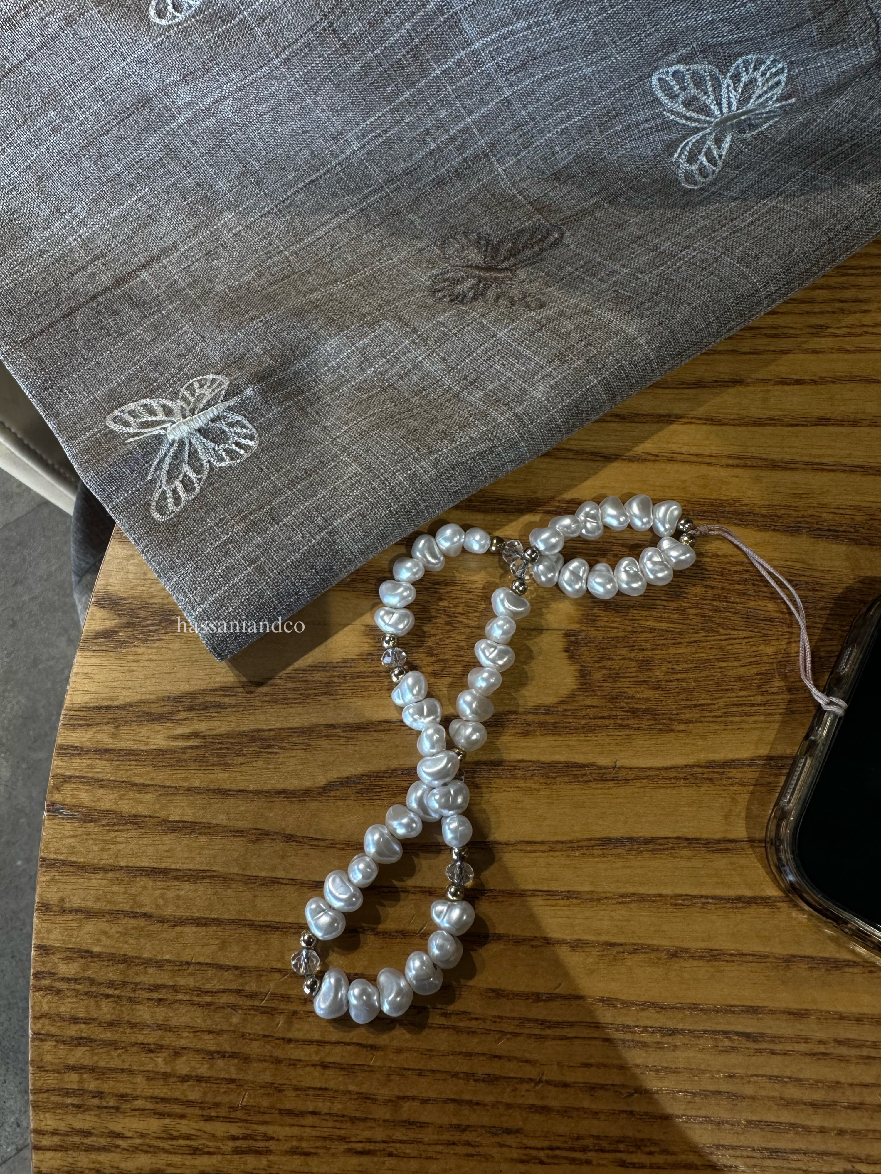 Upgrade your style with our cute, beaded phone charms made from synthetic Pearl, heart shaped beads, held together with string which can be attached to your phone case. Please note due to availability, the beads in between the hearts can be either silver or gold.