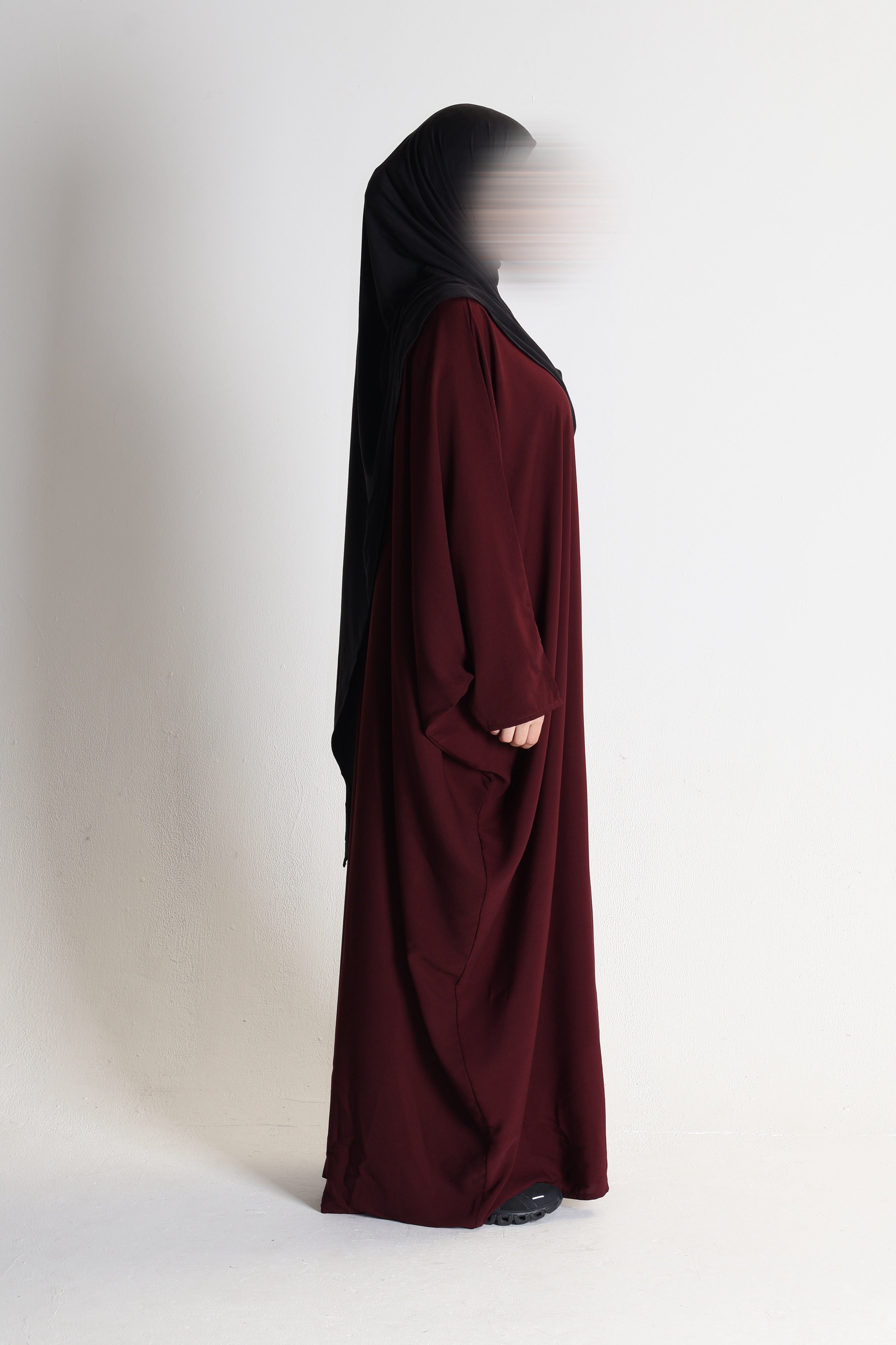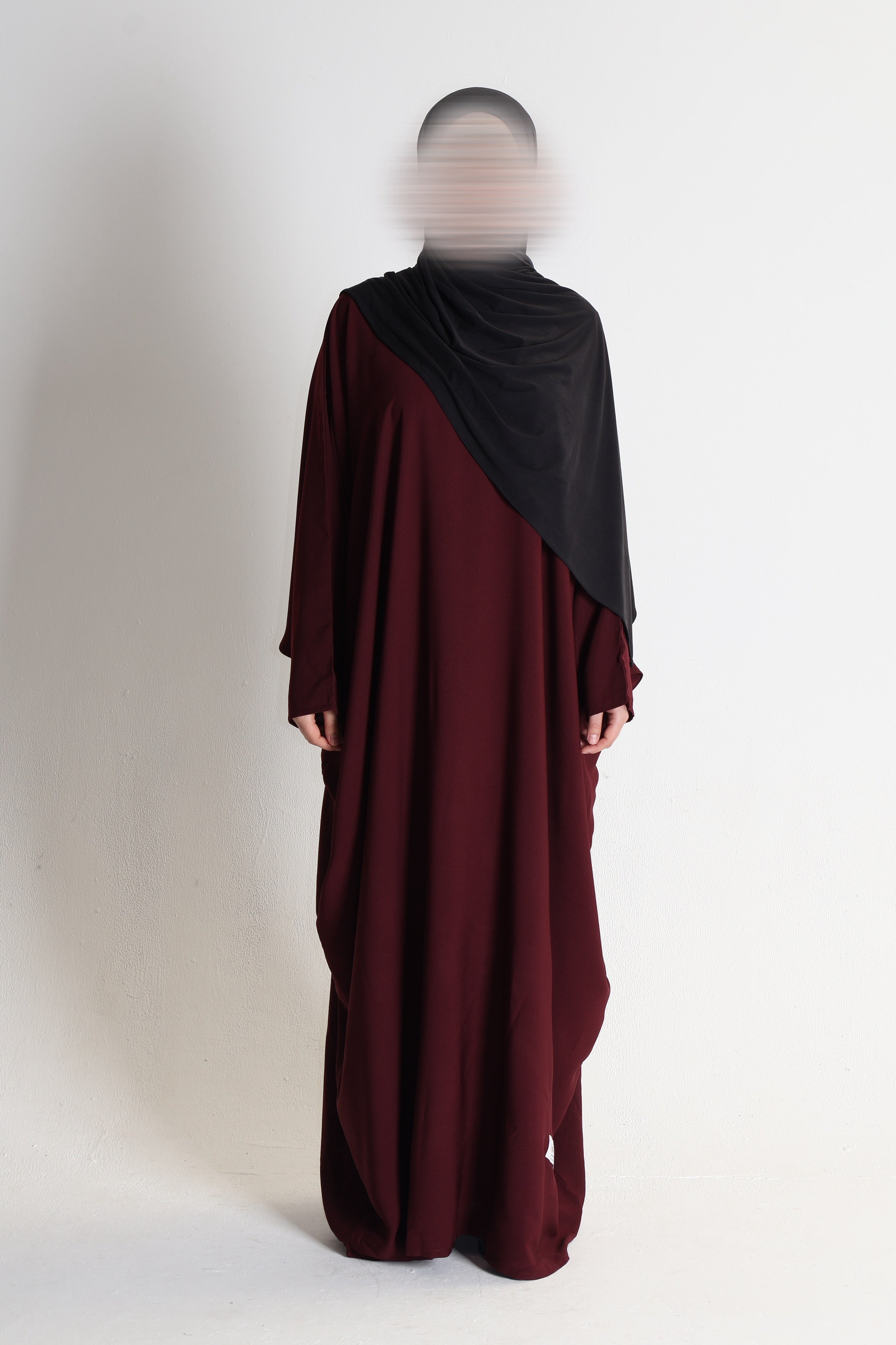 Our lightweight, looser deep red abaya which flows so beautifully and maintains full coverage at all times. Complete with a Hassani tag