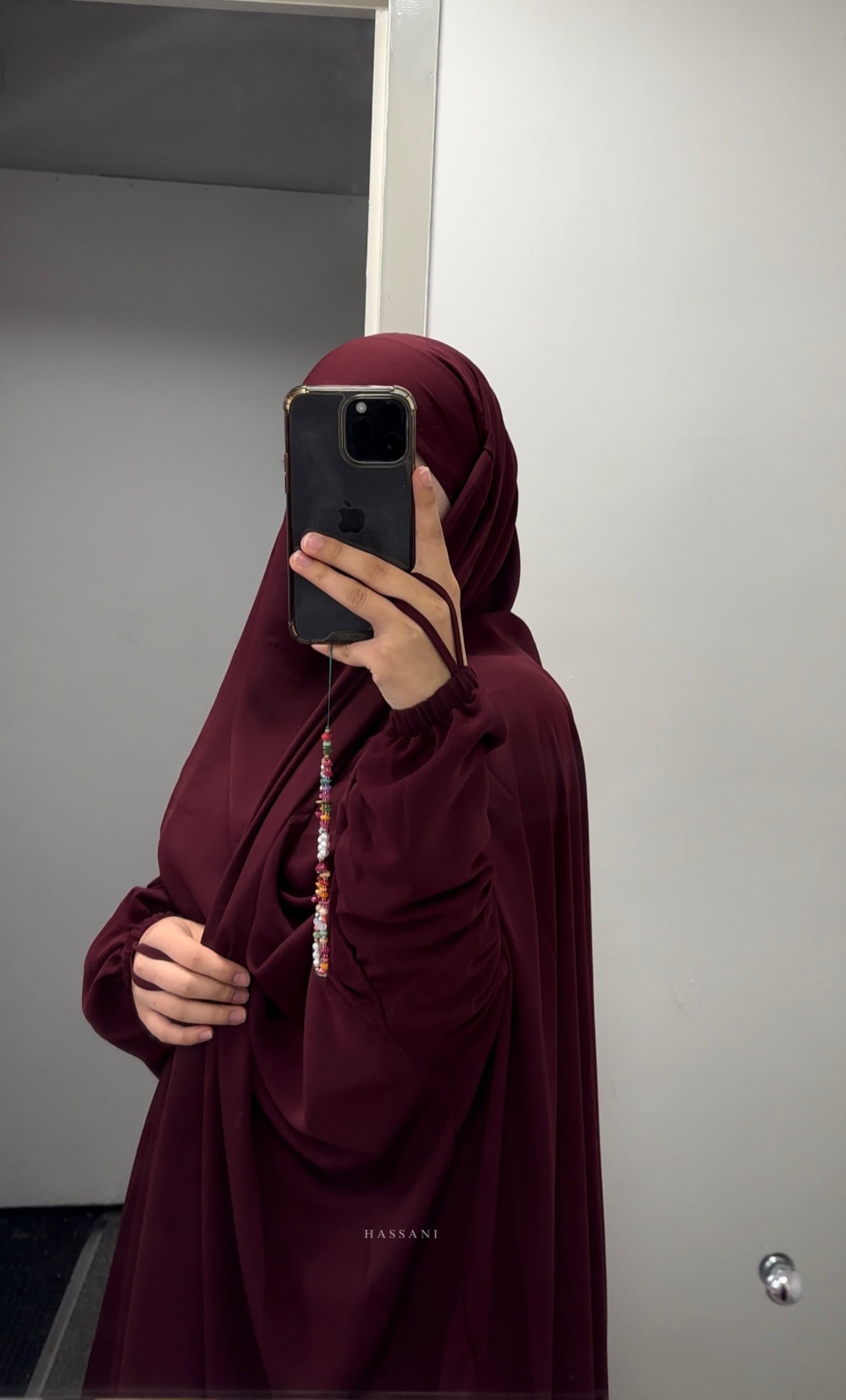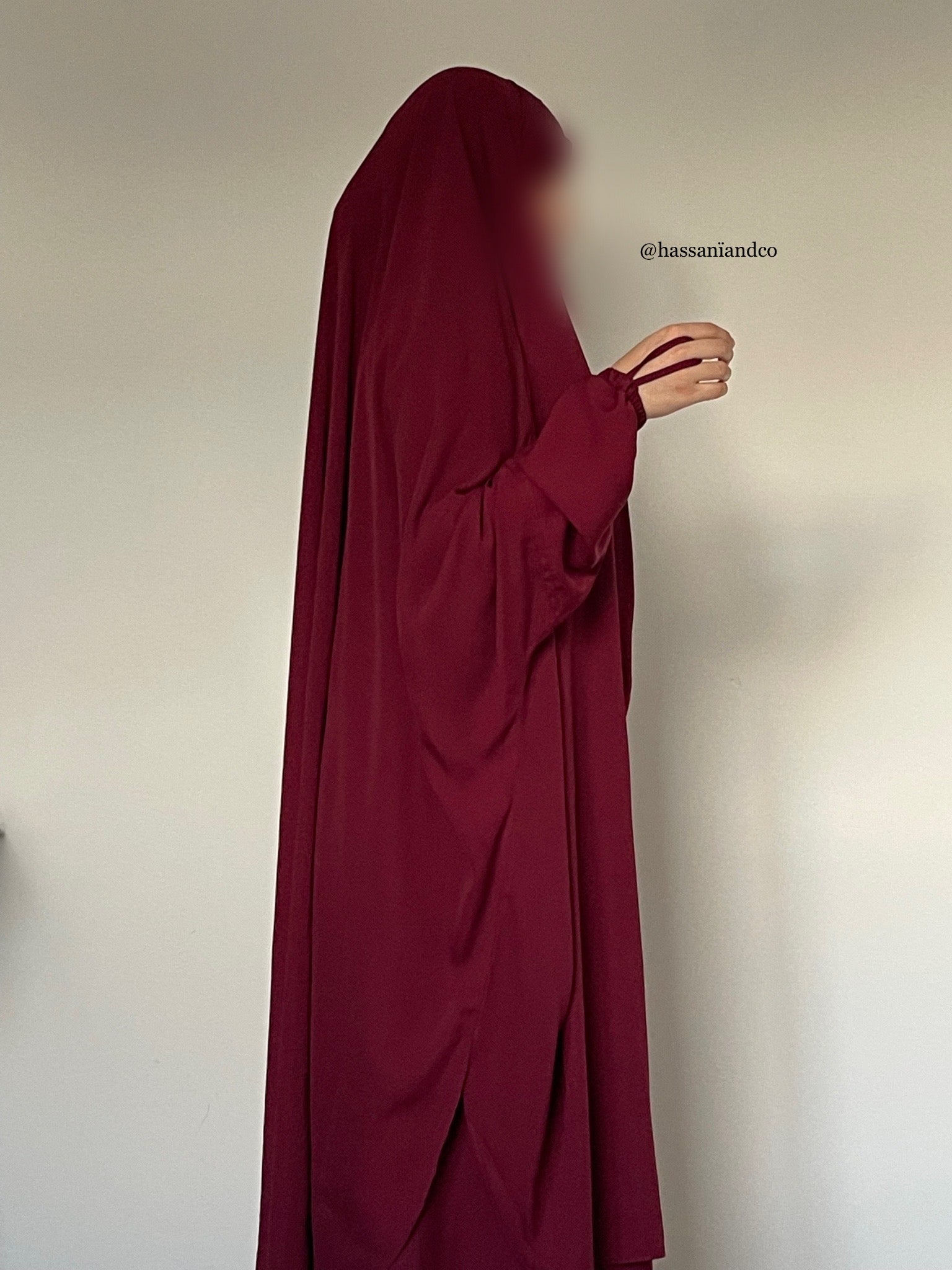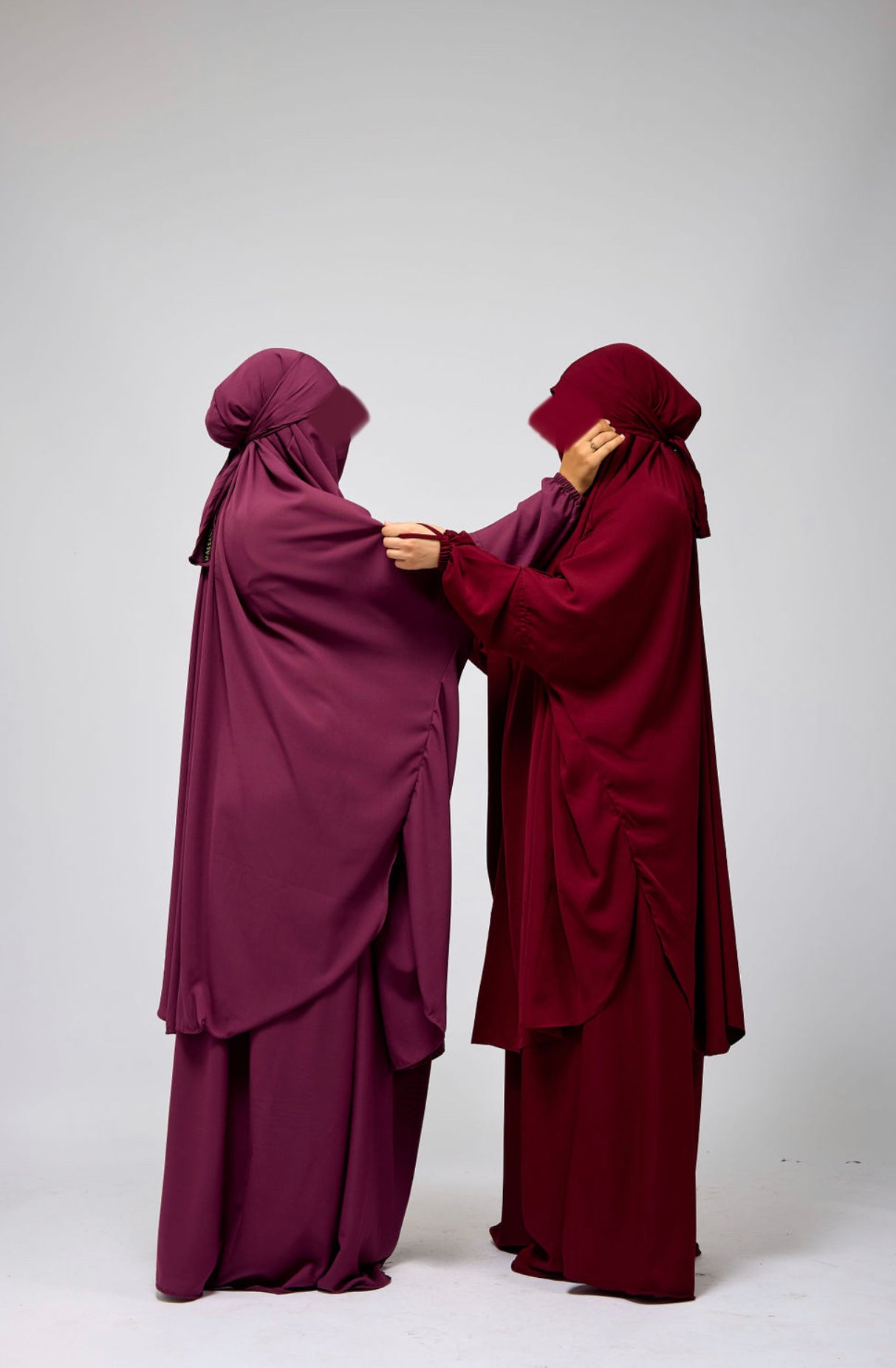Our rouge two piece jilbab. Includes a top piece with a skirt, made in one size to fit all!