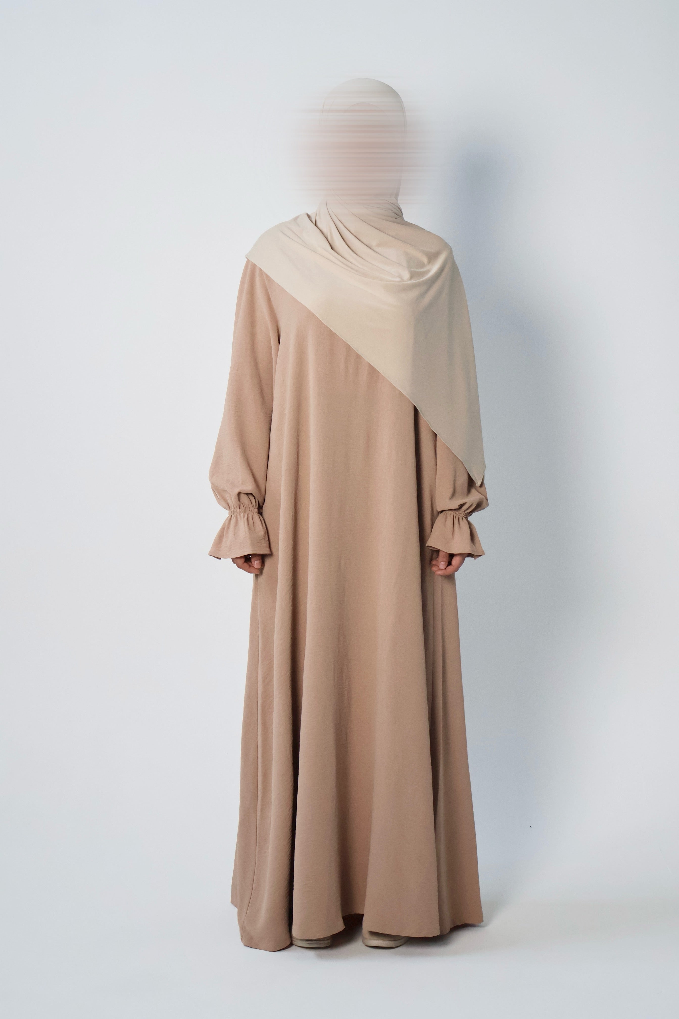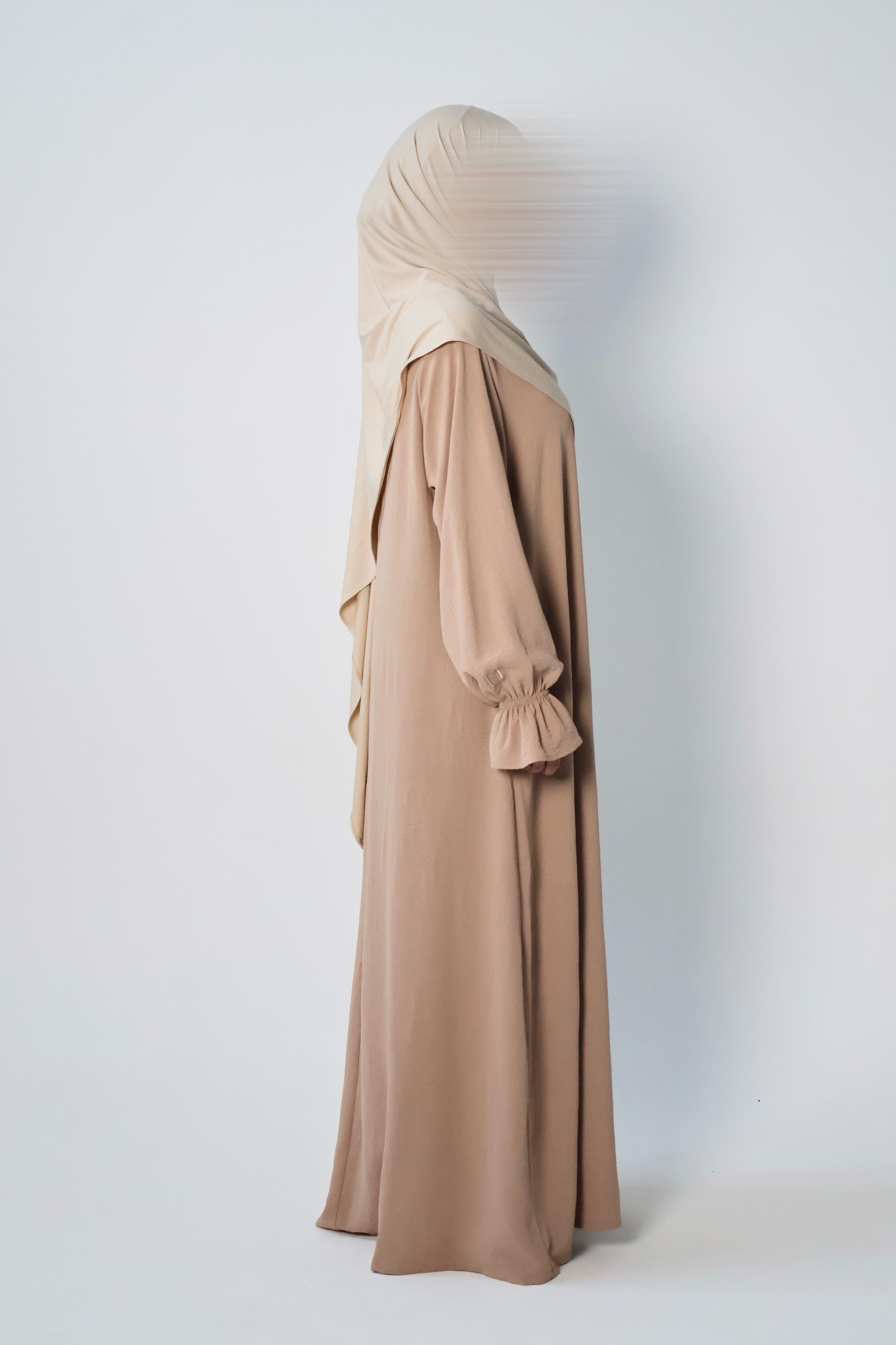 Essential poet sleeve style closed abaya in SAND. Stitched with a protected neckline for durability and two side slit pockets