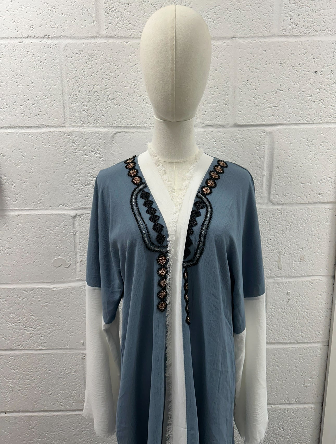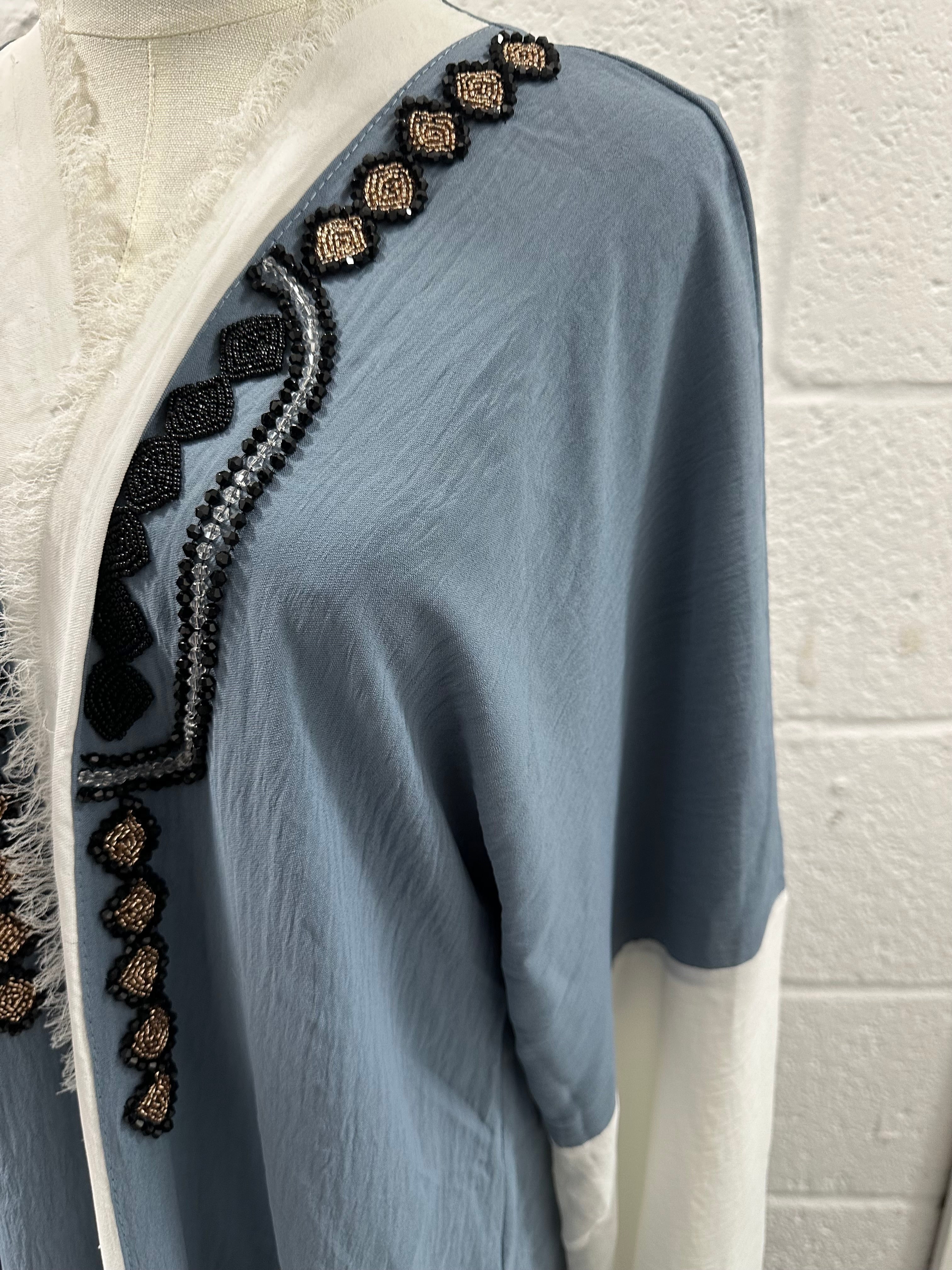 Unique two tone crepe open abaya with distressed frayed edging style and beadwork along the chest. SIZE 58 - thin crepe material perfect for summer