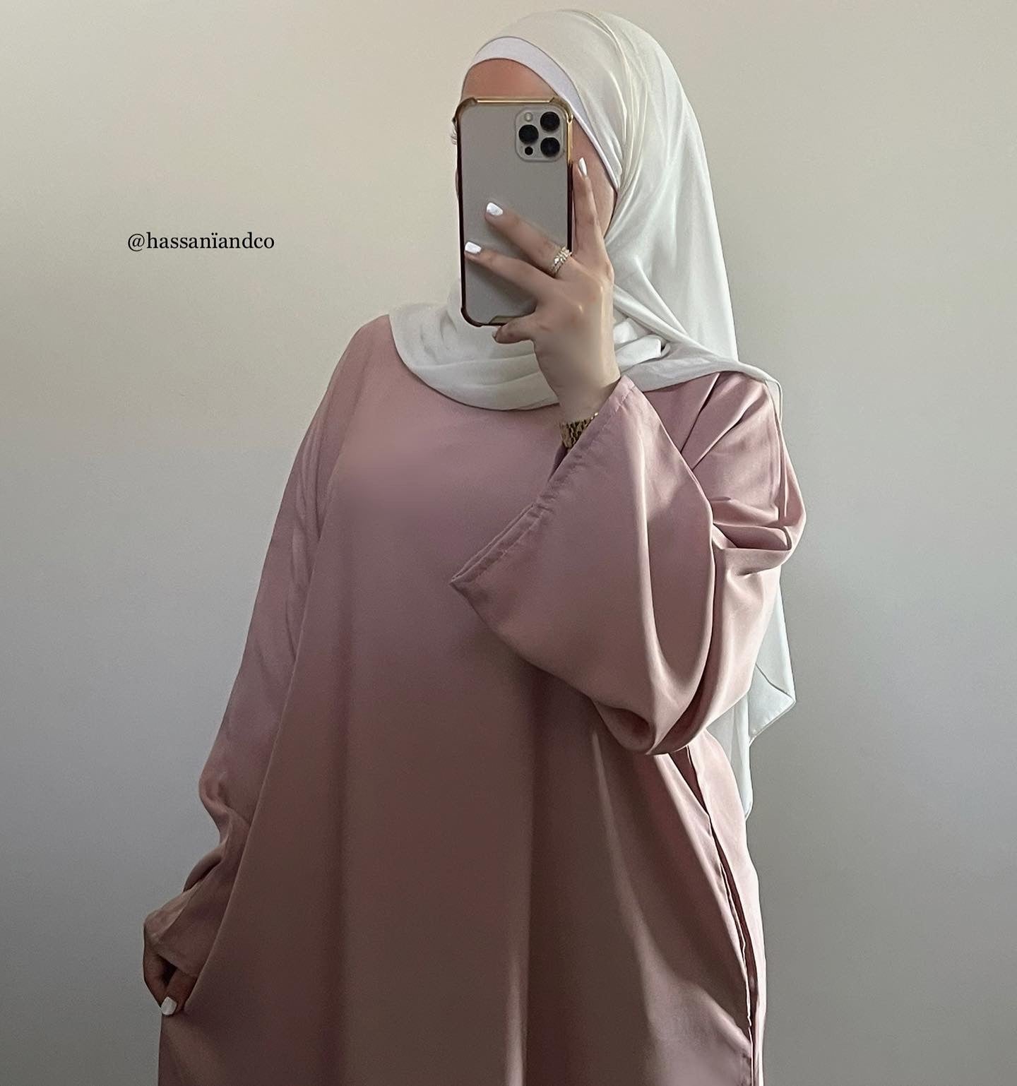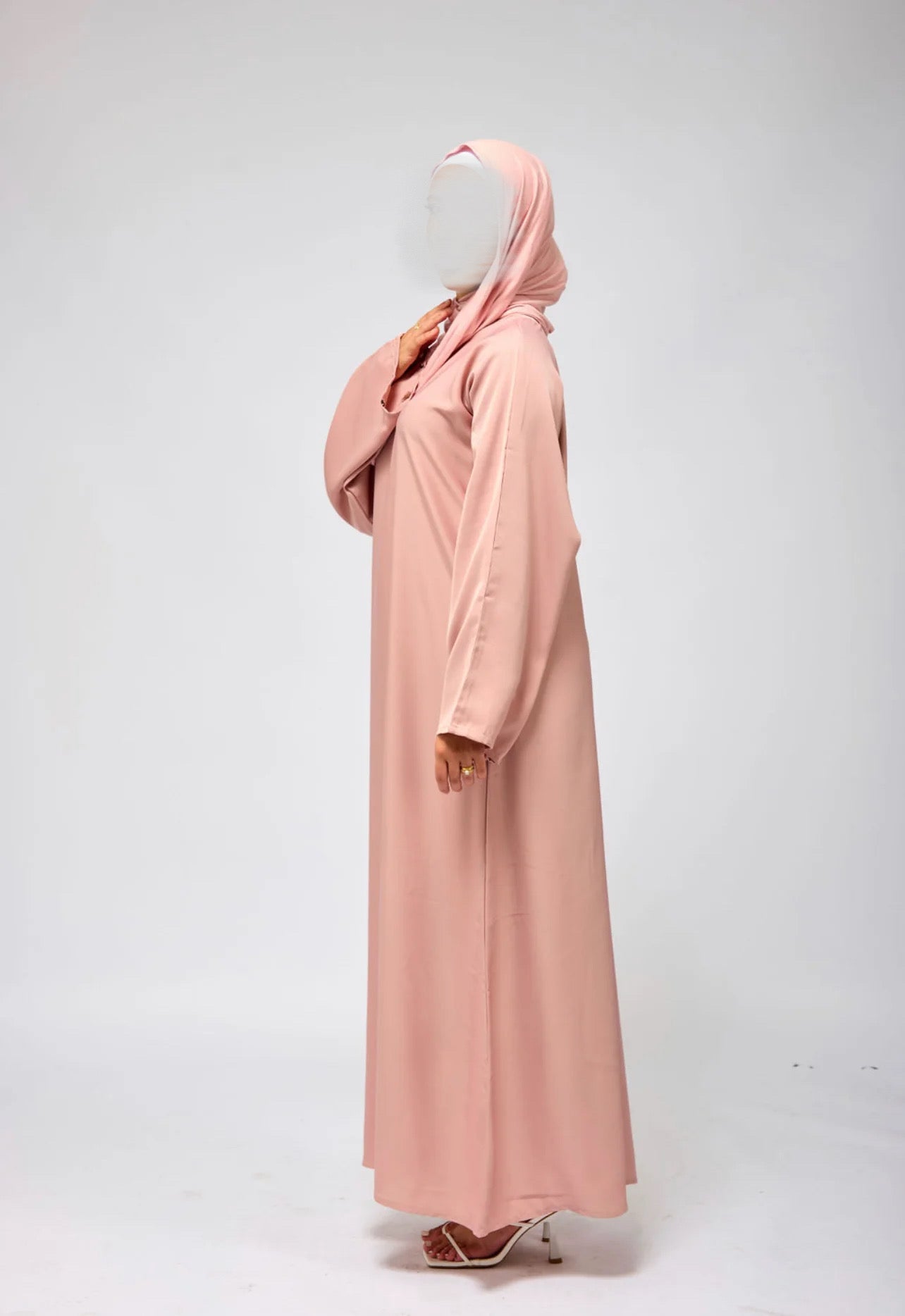Our straight cut, yet loose fit light pink abaya. A beautiful, summer colour, an essential for every lady’s wardrobe. Tailored with wide sleeves fitted with a hidden button inside to give you the option of preventing the sleeve from sliding as well as a side slit pocket, for day to day convenience!