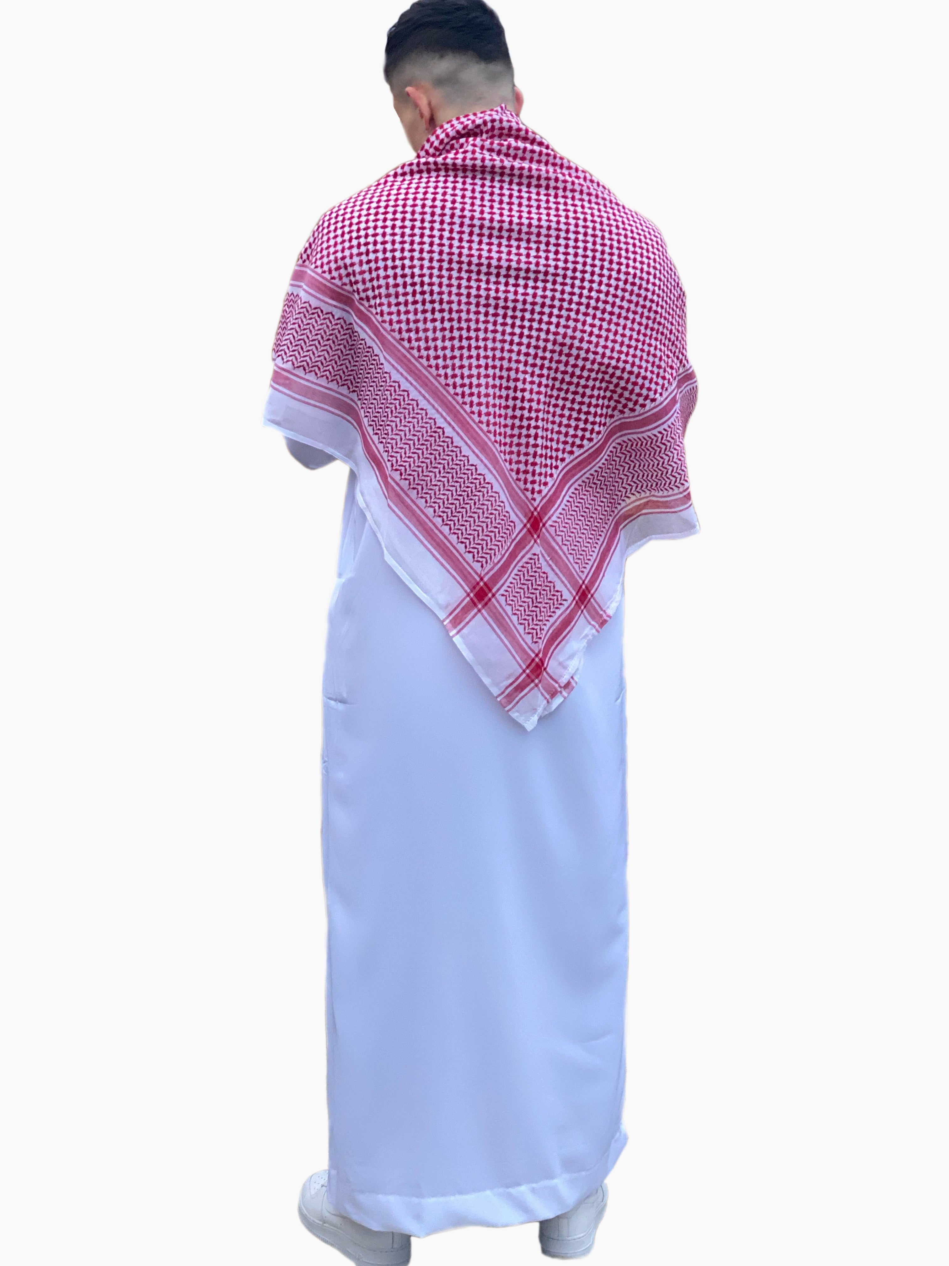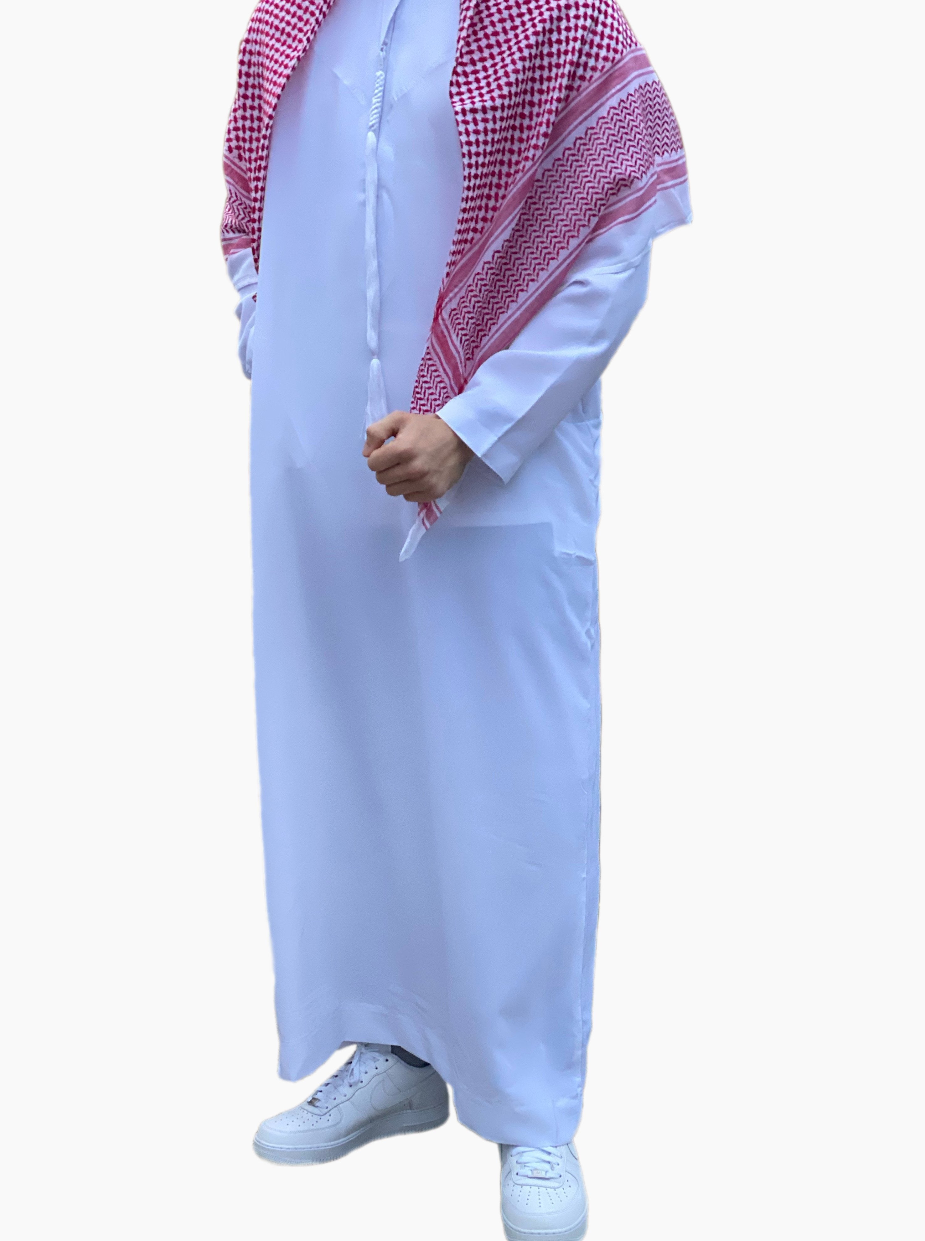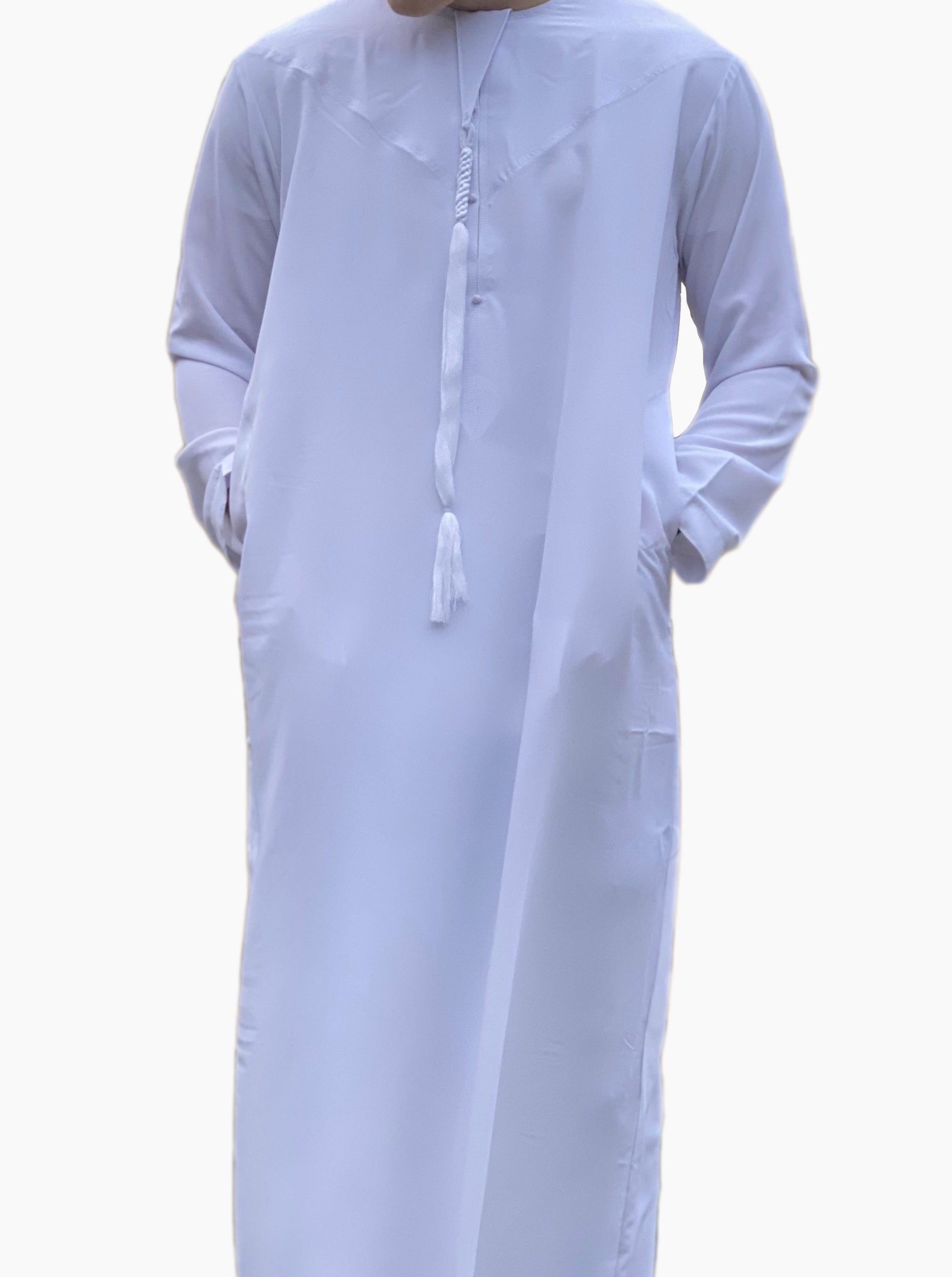 Crisp, white Emirati style thobe. Includes a removable tarboosh (tassel) and pockets on both sides. Perfect for everyday wear. Available in multiple sizes